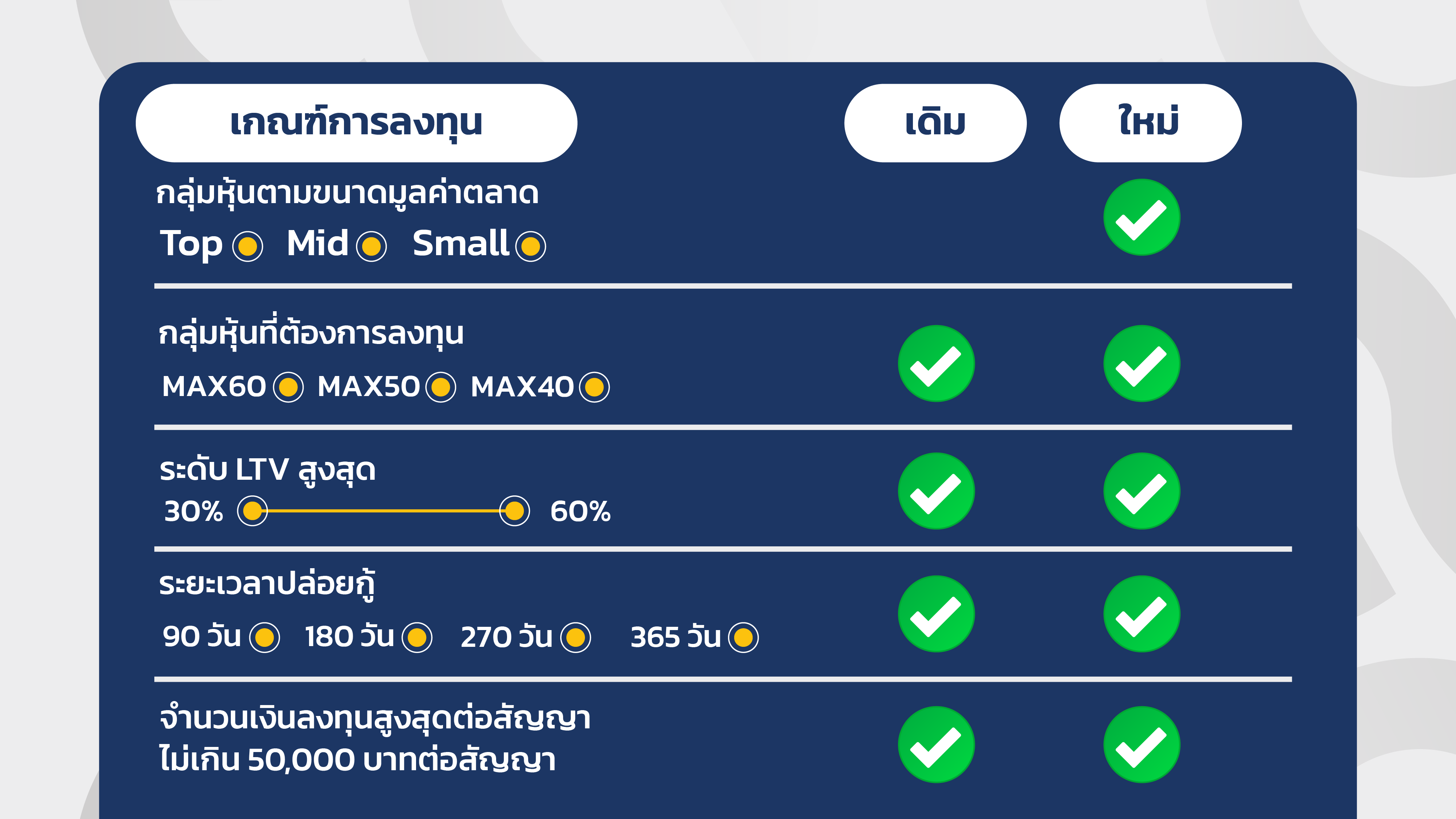บริษัท ฯ ได้เพิ่มหุ้น mai เป็นหลักประกัน และปรับเกณฑ์การลงทุน ทำให้ตลาดสินเชื่อด้วยหุ้นเข้าถึงได้มากขึ้น โดยเฉพาะในกลุ่มผู้กู้ที่ต้องการบริหารพอร์ตอย่างยืดหยุ่นและปลอดภัย และมีประสิทธิภาพสูง เพื่อสร้างระบบนิเวศทางการเงินที่ตอบโจทย์ทั้งนักลงทุนและผู้กู้ในยุคดิจิทัล ผู้กู้ไม่จำเป็นต้องขายหุ้นในพอร์ตออกไปแม้แต่หุ้นเดียว ซึ่งบริการนี้มาพร้อมอัตราดอกเบี้ยเริ่มต้นเพียง 5.95% ต่อปี