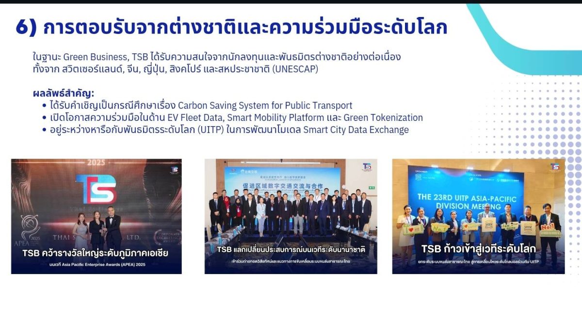 4. TSB เป็นองค์กรเดียวที่สามารถดำเนินการ เคลมคาร์บอนเครดิตได้ โดยได้ร่วมมือกับพันธมิตรระดับโลก ประกอบด้วย การได้รับเชิญเป็นสมาชิก ของ Union Internationale des Transports Publics (UITP) ซึ่งเป็นระบบขนส่งระดับโลก โดย ประธานของ UITP เคยกล่าวว่า น.ส.กุลพรภัสร์ วงศ์มาจารภิญญา ประธานเจ้าหน้าที่บริหาร บริษัท ไทยสมายล์ บัส ถือ เป็น “Diamond แห่งเอเชีย”