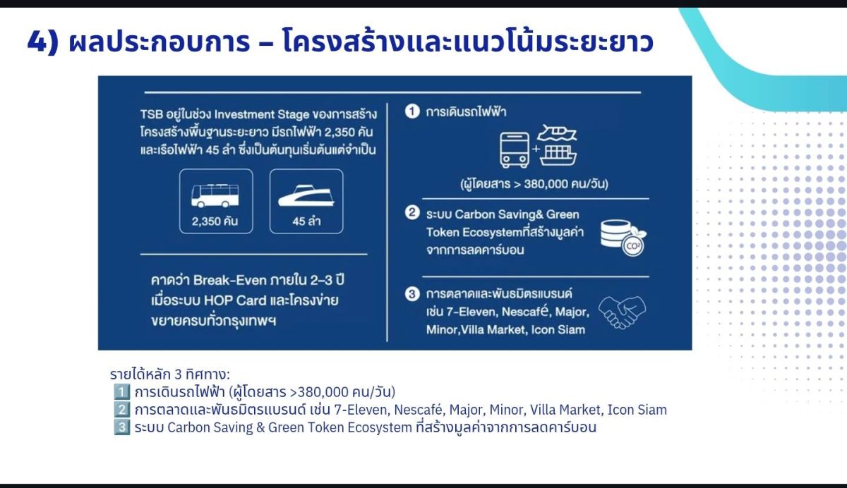 น.ส.กุลพรภัสร์ กล่าวว่า สำหรับ ธุรกิจและการลงทุนของ TSB ที่ผ่านมา ในด้านรายได้ไม่เป็นไปตามแผน เพราะต้องเผชิญความท้าทายหลายอย่างมาก ส่วนใหญ่เกี่ยวข้องกับการดำเนินงานในสภาพแวดล้อมที่ไม่เป็นไปตามสมมติฐานที่ใช้ในการวางแผนการลงทุนและการปฏิรูปเส้นทางเดินรถ ตามแผนการปฏิรูประบบขนส่งมวลชนของรัฐบาล และแผนฟื้นฟู ขสมก. ที่คณะรัฐมนตรีอนุมัติไว้, เชื่อว่าจำนวนผู้โดยสารจะเติบโตขึ้นตามที่คาดการณ์ และจะได้รับสัมปทานบนเส้นทางที่เป็นสิทธิ์ของ TSB แต่เพียงผู้เดียว ตามระบบการปฏิรูป “1 สาย 1 ผู้ประกอบการ”