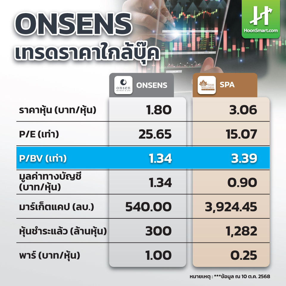 HoonSmart.om>>”ออนเซ็น รีทรีต แอนด์ สปา กรุ๊ป” (ONSENS) ดิ่งแรงผิดปกติ เหลือ 1.60 บาท 14 ต.ค.นักกลยุทธ์มองน่าสนใจ แนะนักลงทุนดู P/BV เพียง 1.19 เท่า ไม่ควรใช้ข้อมูลในอดีต P/E จุดแข็งฟรีโฟสต่ำแค่ 80 ล้านหุ้น มาร์เก็ตแคป 540 ล้านบาท โมเดลธุรกิจ อัตรากำไรสูงจากต้นทุนส่วนใหญ่เป็นคงที่ ต้นทุนต่อหัวลดลงเมื่อลูกค้าเพิ่ม จ่อเปิดสาขา Flagship ใหม่ที่ทองหล่อ เติบโตตามเทรนด์ธุรกิจสุขภาพ แฉต้นเหตุราคาดิ่งคาด”เจ้าเข้า”กดหุ้นเก็บของถูก กลุ่มเดย์เทรดแห่ทิ้งสิ้นวัน