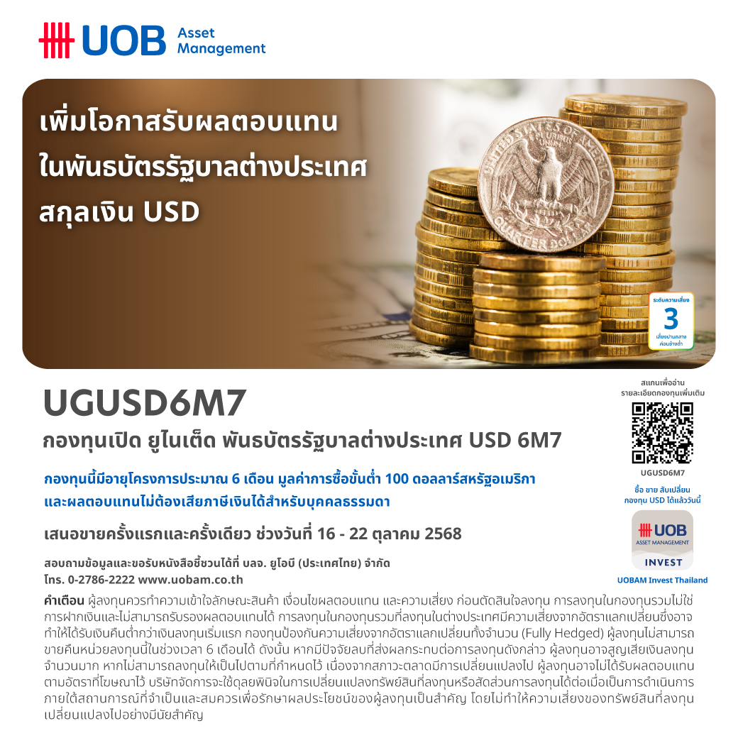 บริษัทหลักทรัพย์จัดการกองทุน (บลจ.) ยูโอบี (ประเทศไทย) จำกัด หรือ UOBAM เปิดเสนอขายหน่วยลงทุนครั้งแรก (IPO) กองทุนเปิด ยูไนเต็ด พันธบัตรรัฐบาลต่างประเทศ USD 6M7 (UGUSD6M7) อายุประมาณ 6 เดือน มีประมาณการผลตอบแทน 3.60% ต่อปี (ข้อมูลจากอัตราผลตอบแทนที่เสนอโดยผู้ออกตราสาร หรือจากผู้ขาย ณ วันที่ 9 ตุลาคม 2568) กองทุนมีขนาดโครงการ 200 ล้านดอลลาร์สหรัฐ โดยเสนอขายในราคา 10 ดอลลาร์สหรัฐต่อหน่วย และยอดลงทุนครั้งแรกขั้นต่ำ 100 ดอลลาร์สหรัฐ