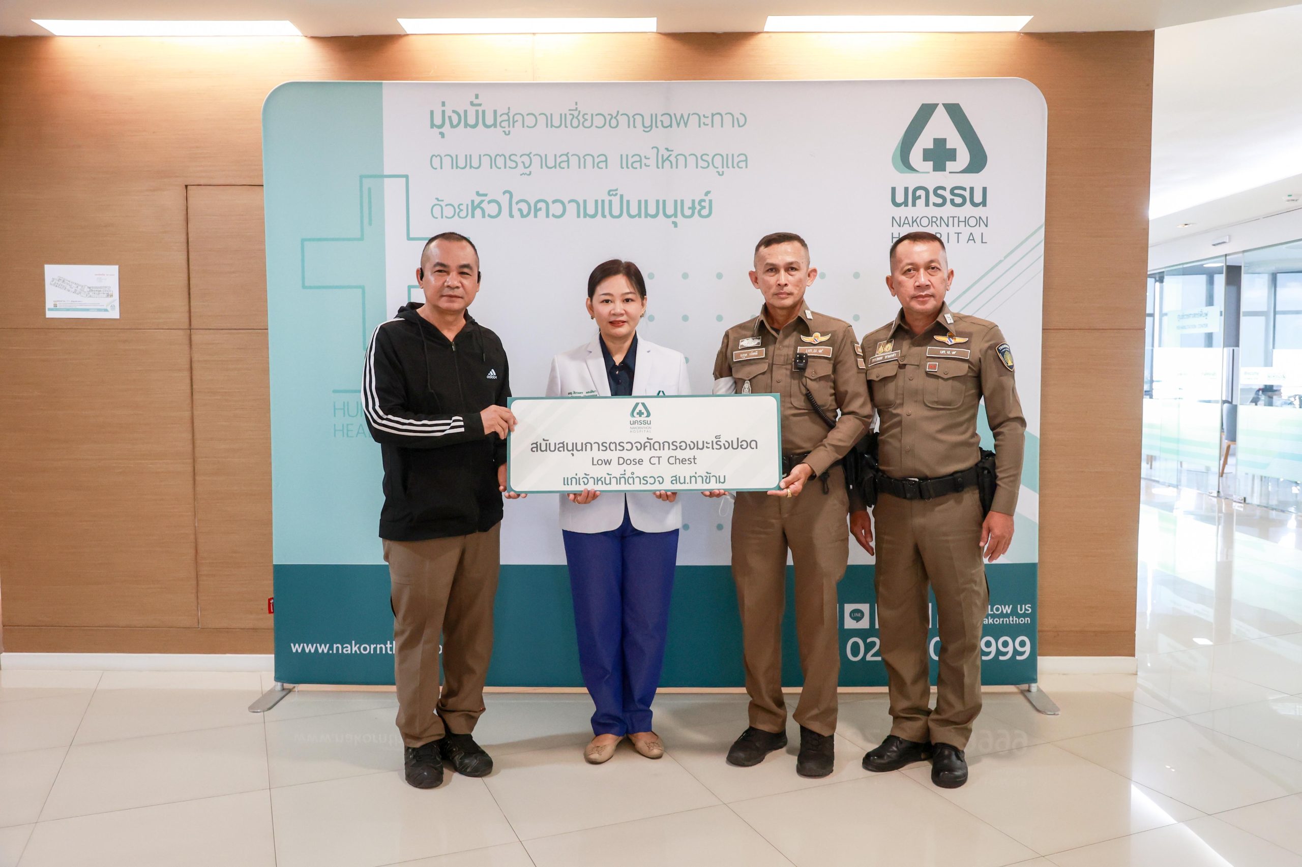 บริษัทโรงพยาบาลนครธน (NKT) แสดงความห่วงใยต่อสุขภาพของเจ้าหน้าที่ตำรวจจราจร สถานีตำรวจนครบาลท่าข้าม โดย แพทย์หญิงศิเรมอร ทองสิมา (ที่ 2 จากซ้าย) ผู้อำนวยการสายงานแพทย์ โรงพยาบาลนครธน เป็นผู้แทนมอบโปรแกรมตรวจสุขภาพปอดให้แก่ตำรวจจราจร จำนวน 25 นาย โดยมี พ.ต.ท. อิทธิพันธ์ หาญเวช สารวัตรจราจร สน.ท่าข้าม (ที่ 1 จากซ้าย) ให้เกียรติรับมอบ