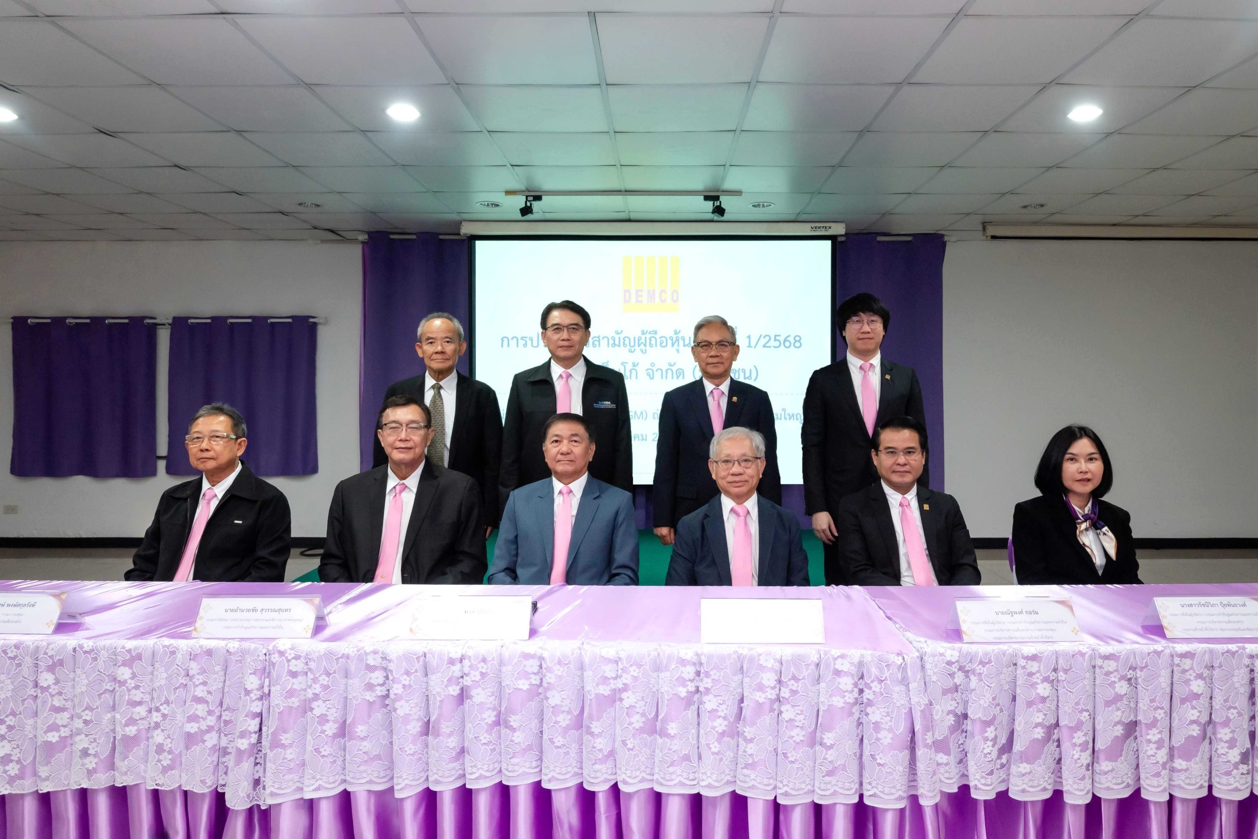 นายนำชัย หล่อวัฒนตระกูล (นั่งที่ 3 จากขวา) ประธานกรรมการ, นายสมพงษ์ ปรีเปรม (นั่งที่ 3 จากซ้าย) ประธานกรรมการบริหาร, นายณัฐพงศ์ กอร่ม (นั่งที่ 2 จากขวา) ประธานเจ้าหน้าที่บริหาร และนายโชคชวาล ยังถาวรตระกูล (ยืนที่ 1 จากขวา) ประธานเจ้าหน้าที่บริหาร กลุ่มงานบริหารการเงิน บริษัท เด็มโก้ (DEMCO) พร้อมด้วยคณะกรรมการบริษัท ถ่ายภาพเป็นที่ระลึกร่วมกันในการประชุมวิสามัญผู้ถือหุ้น ครั้งที่ 1/2568 โดยประชุมผ่านสื่ออิเล็กทรอนิกส์ (E-EGM)