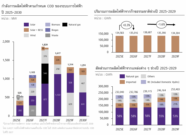 ส่วนในระยะกลาง ปี 2570-2573 มีแผนผลิตไฟฟ้าตามสัญญาที่จะผลิตราว 1,200-1,600 MW ต่อปี ซึ่งคิดเป็นมูลค่าการลงทุนราว 43,000-56,000 ล้านบาทต่อปี โดยเฉพาะจากพลังงานแสงอาทิตย์และพลังงานลมจากรอบการรับซื้อ Big lot1 ที่ 5.2 GW และ lot2 ที่ 2.1 GW