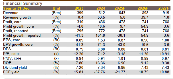 ในปี 2568F และ 2569F คาดว่าจะจ่ายเงินปันผลจากผลการดำเนินงานและกำไรสะสมบางส่วนในอัตราหน่วยละ 0.80 บาท และเพิ่มเป็น 0.81 บาทตามลำดับ อิงราคาปัจจุบันจะให้ผลตอบแทนเงินปันผลประมาณ 7% ต่อปี