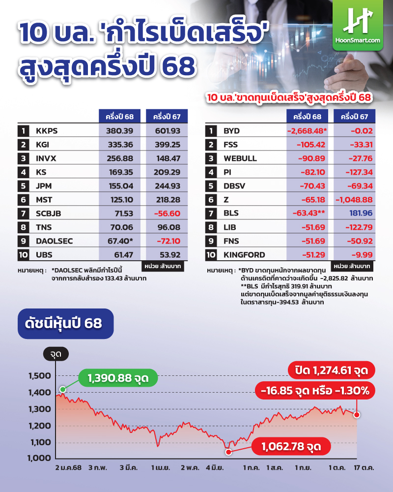 HoonSmart.om>>อุตสาหกรรมหลักทรัพย์น่าจะฝ่าวิกฤตการณ์ไปได้ หลังตลาดหุ้นไทยตกต่ำมานานและยังสะบักสะบอมจากดัชนี SETดิ่งลงแรงถึง 22.2% แย่ที่สุดในภูมิภาค ในช่วง 6 เดือนแรกของปี 2568 ภาพรวมผลการดำเนินงานครึ่งปีของบริษัทหลักทรัพย์(บล.) ธุรกิจชะลอตัวไม่รุนแรงอย่างที่คาด 18 บริษัทยังโชว์กำไรเบ็ดเสร็จได้อย่างแข็งแกร่ง ส่วนอีก 21 บริษัทรายงานขาดทุนเบ็ดเสร็จ และ 4 รายยังไม่เปิดเผยข้อมูล คาดครึ่งปีหลังน่าจะค่อยๆดีขึ้น