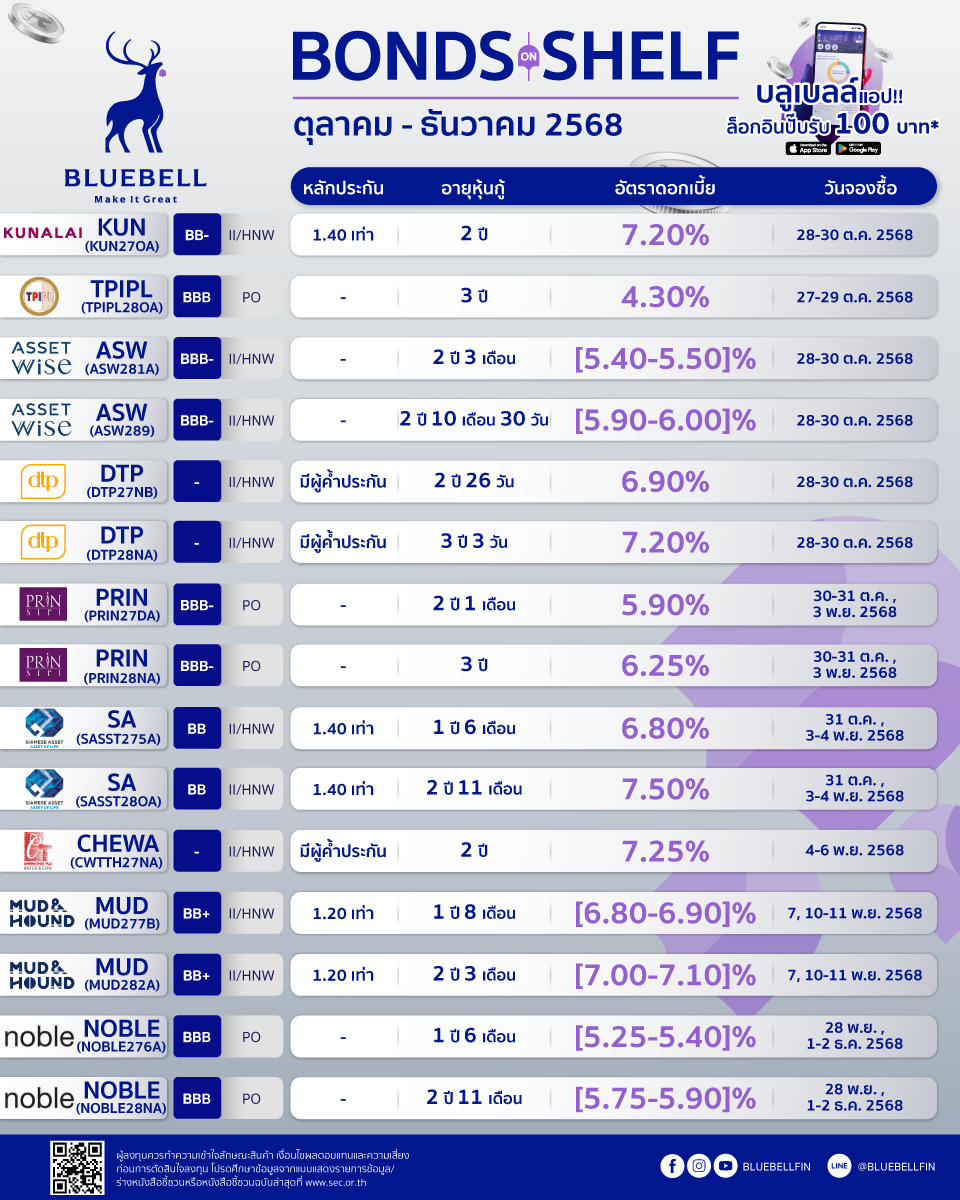 ทั้งนี้ ผู้สนใจดูรายละเอียดเพิ่มเติม https://bluebellgroup.co.th/bond/ หรือสอบถามข้อมูลเพิ่มเติมผ่าน Line https://lin.ee/JFZeUCP โทร 02 249 2999