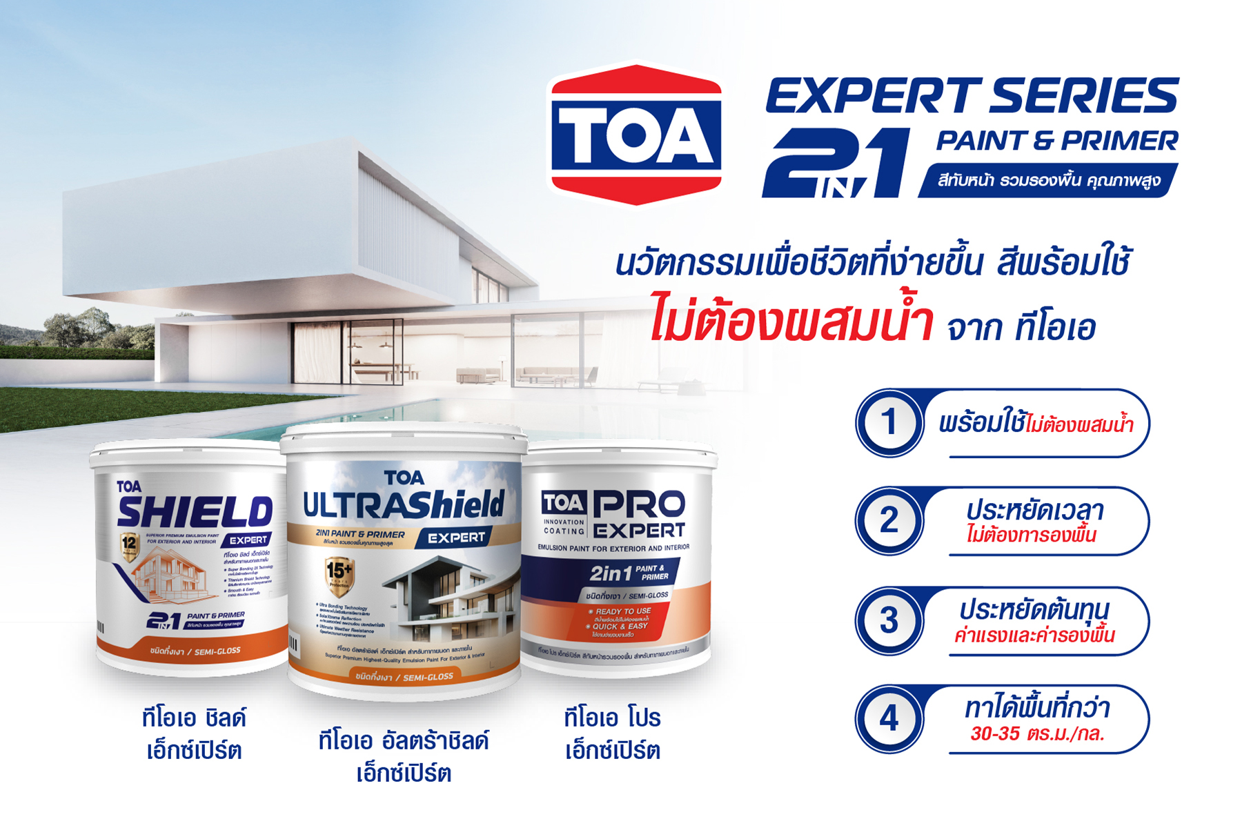 TOA EXPERT SERIES คือนวัตกรรมสีน้ำอะคริลิกที่รวมสีทับหน้ารวมรองพื้นไว้ในกระป๋องเดียว ที่พัฒนาขึ้นเป็นพิเศษสำหรับช่องทางโมเดิร์นเทรดโดยเฉพาะ เพื่อให้เจ้าของบ้านสามารถทาเองได้ง่าย และได้ผลงานระดับมืออาชีพ ประกอบด้วย 3 ผลิตภัณฑ์หลักที่ครอบคลุมทุกความต้องการ
