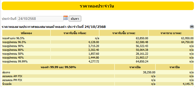 ราคาทองคำมีการปรับเพิ่มขึ้นอย่างต่อเนื่อง รวมถึงเดือนต.ค. 2568 ที่มีการปรับตัวขึ้นอย่างมีนัยสำคัญ เคยขึ้นไปแตะระดับ 66,900 บาทต่อทอง 1 บาท ซึ่งเป็นผลมาจากแรงหนุนราคาทองคำโลก ค่าเงินบาทอ่อนตัวลง และ ความกังวลทางเศรษฐกิจ/ภูมิรัฐศาสตร์ วันนี้ ( 24 ต.ค.2568 ) ก่อนจะร่วงลงมาอยู่ที่ 64,000 บาทต่อทอง 1 บาท ไม่ว่าจะทองขึ้นแรง หรือลงแรง จะเห็นข่าวประชาชนแห่ซื้อทองกันเต็มร้านทอง