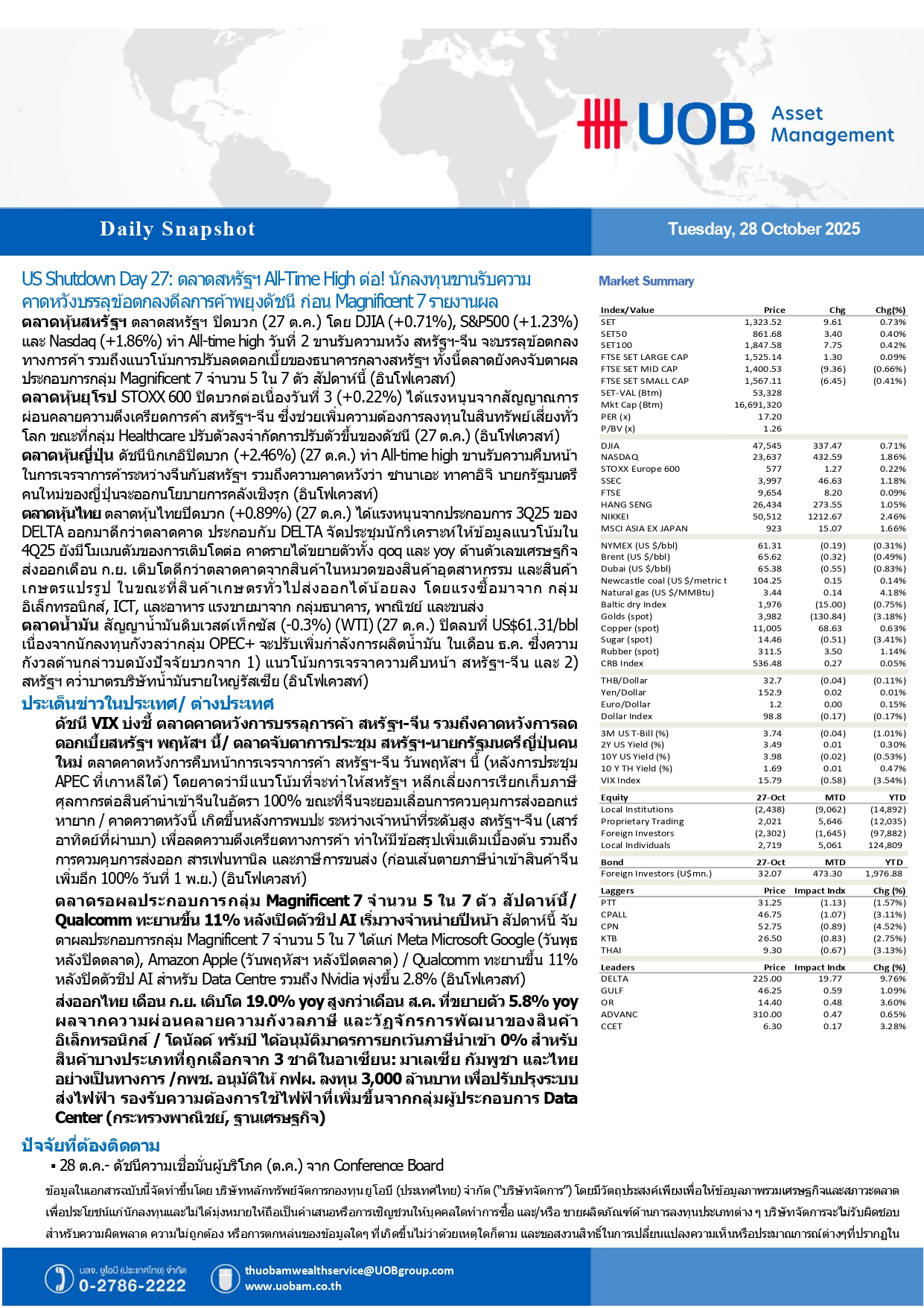 UOBAM Daily Snapshot : ตลาดสหรัฐฯ All-Time High ต่อ! ขานรับความคาดหวังบรรลุข้อตกลงดีลการค้า 28/10/2025 09:55009Breaking News, Fund Manager HoonSmart.com>> UOBAM Daily Snapshot : US Shutdown Day 27: ตลาดสหรัฐฯ All-Time High ต่อ! นักลงทุนขานรับความคาดหวังบรรลุข้อตกลงดีลการค้าพยุงดัชนี ก่อน Magnificent 7 รายงานผล ———————————————————————————————————————————————————– Facebook iconFacebookTwitter iconTwitterLINE iconLine