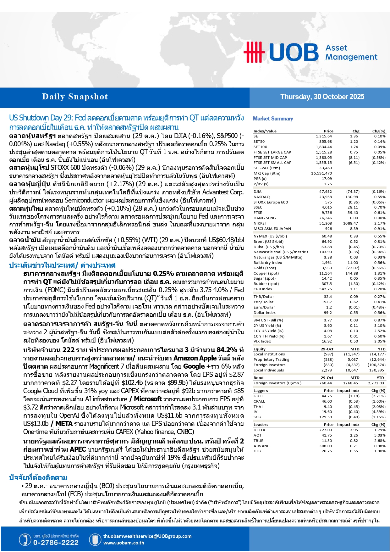 UOBAM Daily Snapshot : Fed หั่นดอกเบี้ยตามคาด ยุติทำ QT แต่ลดความหวังลดดอกเบี้ยธ.ค. ตลาดสหรัฐฯ ปิดผสมผสาน 30/10/2025 09:26009Breaking News, Fund Manager HoonSmart.com>>UOBAM Daily Snapshot : สหรัฐฯ ชัตดาวน์วันที่ 29 Fed ลดดอกเบี้ยตามคาด พร้อมยุติทำ QT แต่ลดความหวังลดดอกเบี้ยgดือนธ.ค. ตลาดสหรัฐฯ ปิดผสมผสาน ———————————————————————————————————————————————————– Facebook iconFacebookTwitter iconTwitterLINE iconLine