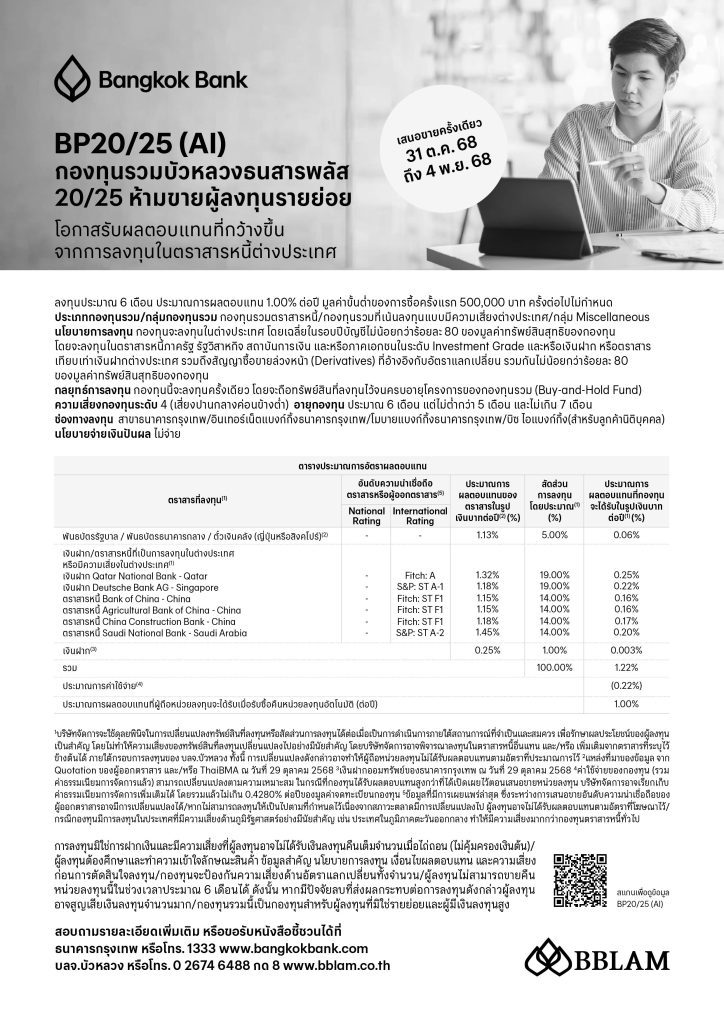 HoonSmart.com>> “บลจ.บัวหลวง” (BBLAM) เปิดขาย IPO ‘กองทุนรวมบัวหลวงธนสารพลัส 20/25 ห้ามขายผู้ลงทุนรายย่อย’ หรือ BP20/25(AI) เทอมฟันด์ อายุ 6 เดือน ตั้งแต่ 31 ต.ค.–4 พ.ย.68 นี้ ลงทุนขั้นต่ำ 500,000 บาท ชูทางเลือกเสิร์ฟผู้ลงทุนมองหาการลงทุน “ตราสารหนี้ต่างประเทศ” เพื่อโอกาสรับผลตอบแทนที่เหมาะสม