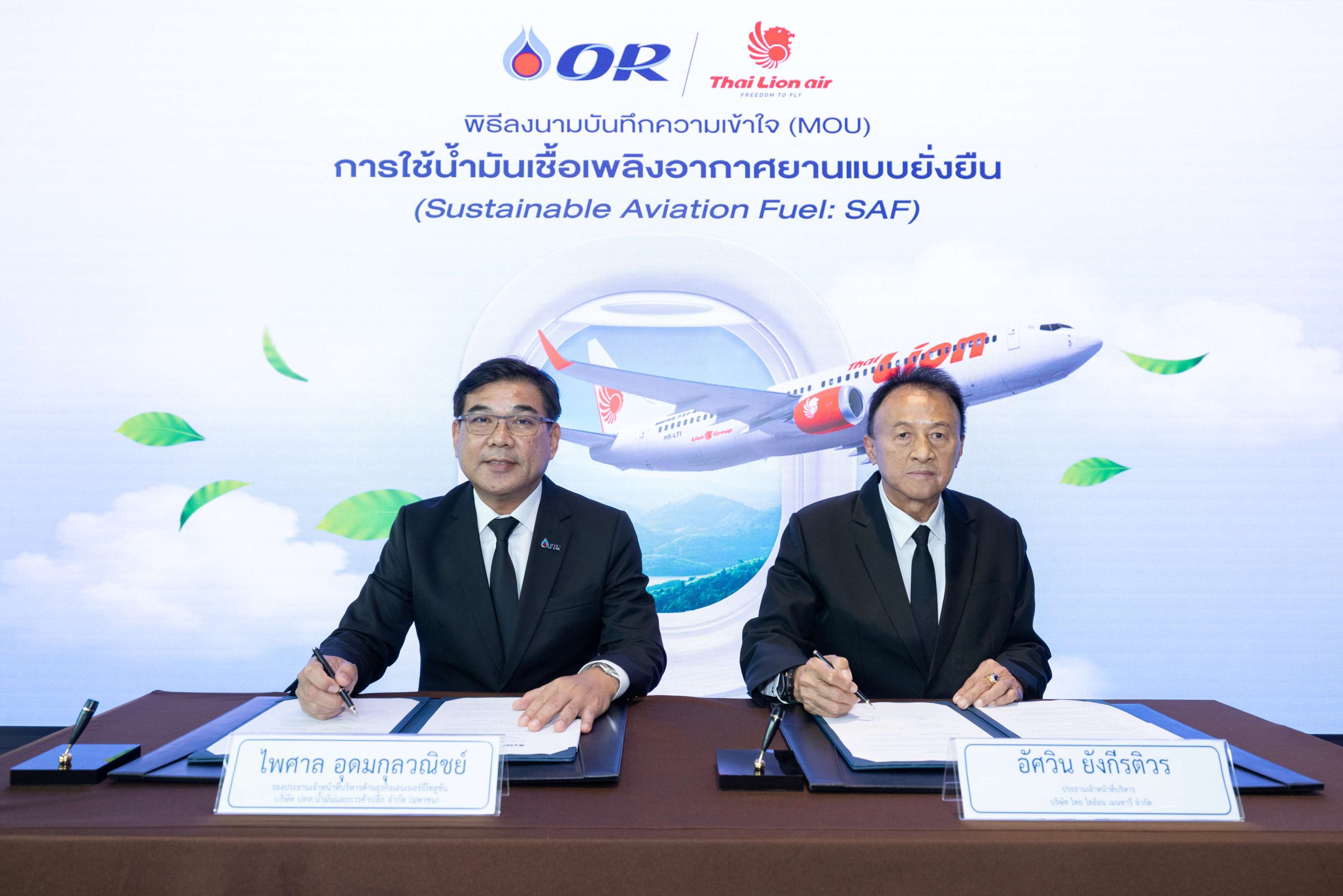 นายไพศาล อุดมกุลวณิชย์ รองประธานเจ้าหน้าที่บริหารด้านธุรกิจเอนเนอร์ยี่โซลูชัน บริษัท ปตท. น้ำมันและการค้าปลีก จำกัด (มหาชน) (OR) และ นายอัศวิน ยังกีรติวร ประธานเจ้าหน้าที่บริหาร สายการบินไทย ไลอ้อน แอร์ ร่วมลงนามบันทึกความเข้าใจ (MOU) เพื่อเริ่มต้นใช้น้ำมันเชื้อเพลิงอากาศยานแบบยั่งยืน หรือ SAF (Sustainable Aviation Fuel) ในเส้นทางบินทั้งภายในประเทศและระหว่างประเทศ โดยมี นางนันทพร โกมลสิทธิ์เวช ผู้อำนวยการฝ่ายการพาณิชย์สายการบินไทย ไลอ้อน แอร์ พร้อมด้วยคณะผู้บริหาร OR ร่วมเป็นสักขีพยาน ณ ห้องประชุม OCRS ศูนย์เอนเนอร์ยี่คอมเพล็กซ์ อาคารบี ซึ่งถือเป็นอีกหนึ่งก้าวสำคัญของการขับเคลื่อนอุตสาหกรรมการบินไทยไปสู่ความยั่งยืน