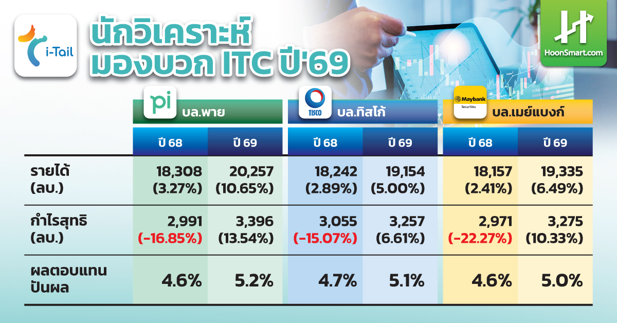 HoonSmart.com>>3 นักวิเคราะห์แนะนำ”ซื้อ” บริษัท ไอ-เทล คอร์ปอเรชั่น (ITC ) กำไรไตรมาส 3 ดีเกินคาด บล.พายคงเป้ากำไรทั้งปีที่ 2,991 ล้านบาท กำไรปีหน้า 3,396 ล้านบาท อัตรากำไรขั้นต้นสูงจากสินค้าพรีเมี่ยม ขนมสัตว์เลี้ยงโตมาก ขยับใช้ราคาเป้าหมายปี 69 ที่ 20.40 บาท บล.ทิสโก้ให้เป้า 18.50 บาท มีกระแสเงินสด 10,000 ล้านบาทสนใจ M&A บล.เมย์แบงก์มองวัฎจักรขาขึ้น ปี 69 กำไรโต 10% จากปีนี้-22% ชูปันผลเด่น 5%
