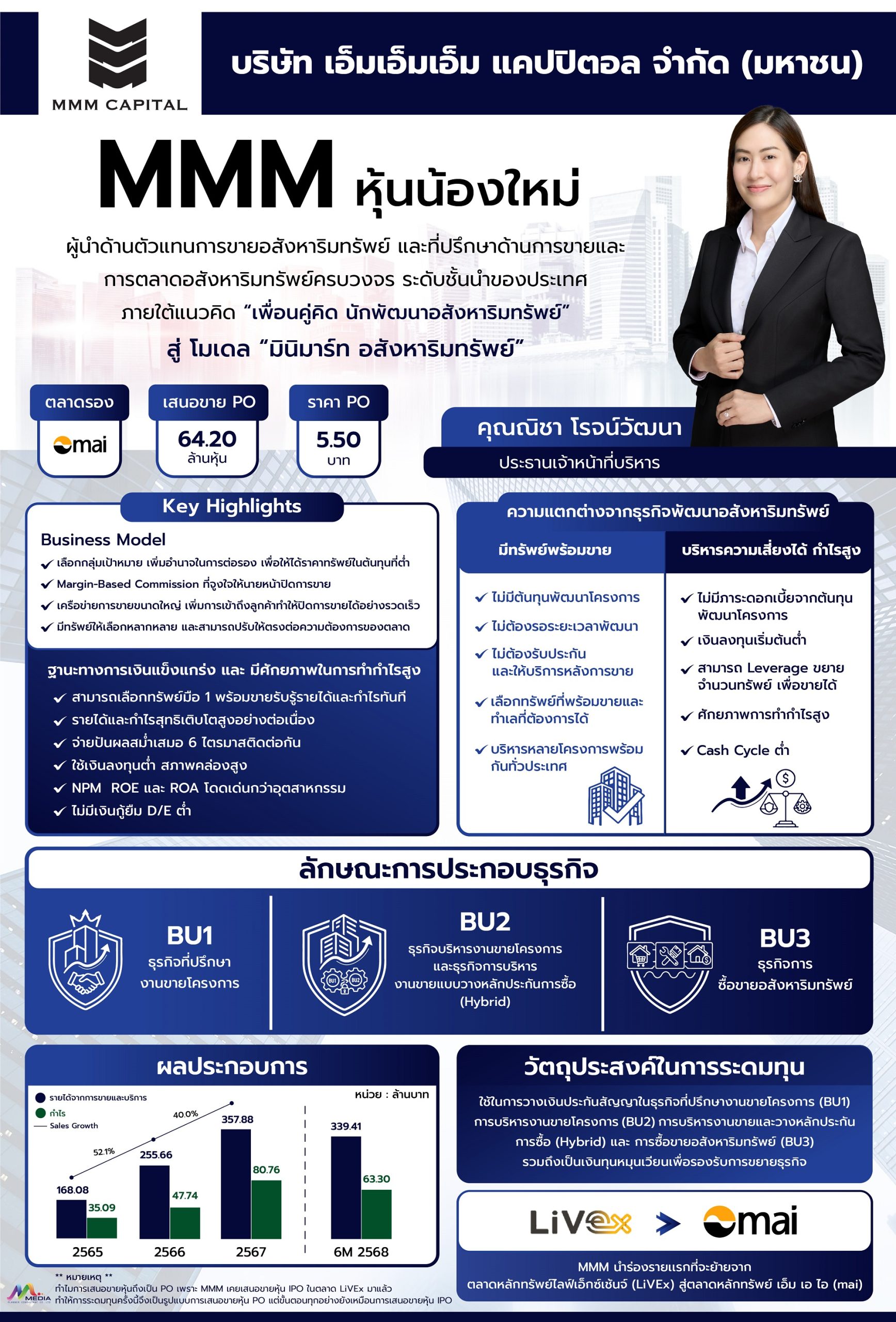 นางสาวเดือนพรรณ ลีลาวิวัฒน์ กรรมการผู้จัดการ บริษัท ไพโอเนีย แอดไวเซอรี่ จำกัด ในฐานะที่ปรึกษาทางการเงินของบริษัท เอ็มเอ็มเอ็ม แคปปิตอล (MMM) เปิดเผยว่า “MMM” ถือเป็นบริษัทนายหน้าอสังหาริมทรัพย์ ที่ดำเนินธุรกิจเป็นตัวแทนขายที่อยู่อาศัยประเภทบ้าน และ คอนโดมิเนียม มือ 1 รายแรก ที่เข้าตลาดหุ้นไทย และเข้าซื้อขายในตลาด mai และด้วยศักยภาพการเป็นผู้ให้บริการด้านตัวแทนการขายอสังหาริมทรัพย์อย่างครบวงจร รวมถึงโมเดลธุรกิจการเป็นตัวแทนขายอสังหาริมทรัพย์เพื่อการอยู่อาศัยทุกประเภท เช่น บ้านเดี่ยว ทาวน์โฮม และคอนโดมิเนียม โดยเน้นพื้นที่กรุงเทพฯ และปริมณฑล รวมถึงการใช้กลยุทธ์การขายผ่านเครือข่ายนายหน้าอิสระขนาดใหญ่ ซึ่งถือเป็นหัวใจหลักในการดำเนินธุรกิจ เป็นจุดแข็งที่ช่วยขยายการเข้าถึงลูกค้าได้อย่างรวดเร็ว ที่สำคัญด้วยประสิทธิภาพการขายของ MMM จึงถูกยกระดับให้เป็นผู้ช่วยด้านการขายและการตลาดอย่างมืออาชีพที่ตลาดอสังหาริมทรัพย์ต้องการในปัจจุบัน