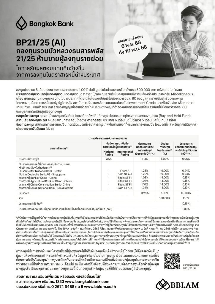 BBLAM เปิดขายเทอมฟันด์ 6 เดือน ‘BP21/25(AI)’ ยีลด์ 1% ต่อปี
