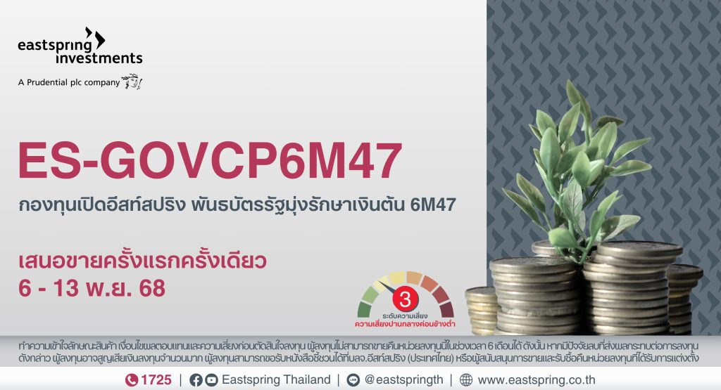 HoonSmart.com>>บลจ.อีสท์สปริง เปิดขาย “กองทุนพันธบัตรรัฐมุ่งรักษาเงินต้น” รุ่นใหม่ “ES-GOVCP6M47” อายุ 6 เดือน มูลค่า 10,000 ล้านบาท คาดผลตอบแทน 1% ต่อปี IPO 6-13 พ.ย. 68 นี้