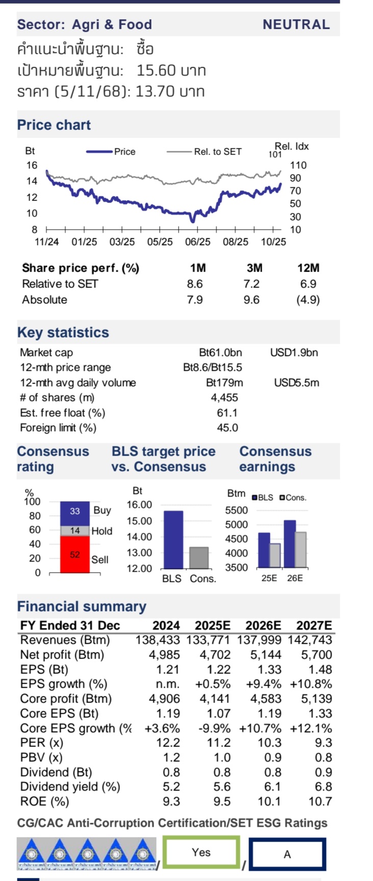 บล.บัวหลวง ปรับคำแนะนำขึ้นเป็น “BUY” ให้ราคาเป้าหมายใหม่ที่ 15.60 บาท จากราคาปัจจุบัน (5/11/68) ที่ 13.70 บาท สะท้อนผลกระทบจากภาษีที่ต่ำกว่าคาด ความสามารถในการบริหาร SG&A ที่ดีขึ้น และการปรับเพิ่มประมาณการกำไรปี 2568–2569 ขึ้น 15–22%