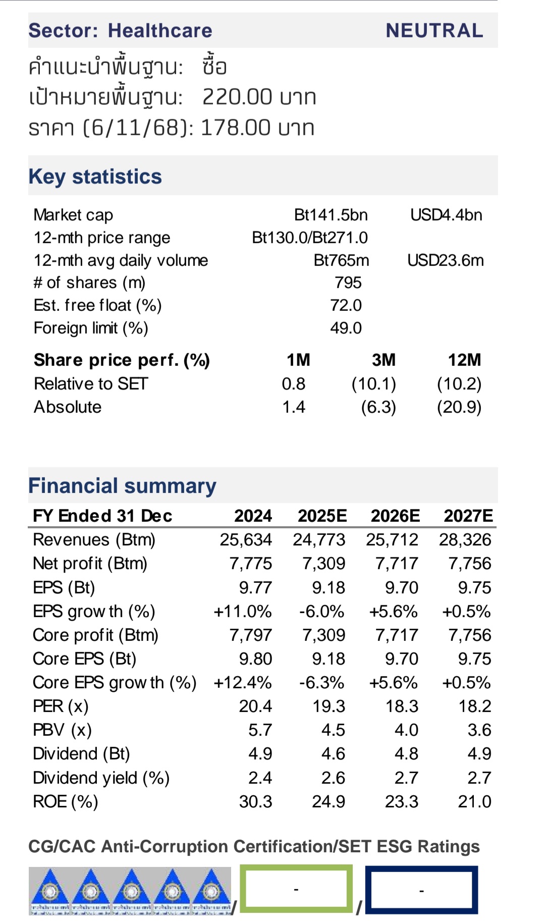 เรายังคงคำแนะนำ “ซื้อ” ที่ราคาเป้าหมายสิ้นปี 2569 ที่ 220 บาท สะท้อนสถานะพรีเมียมที่ยั่งยืนของ BH จากการผสมผสานธุรกิจระหว่างประเทศที่แข็งแกร่ง และการควบคุมต้นทุนที่เหนือชั้น หุ้นซื้อขายที่ PER ปี 2569 ที่ 18 เท่า ยังคงเป็นโอกาสที่น่าสนใจในการปรับราคาใหม่เมื่อเทียบกับกลุ่ม