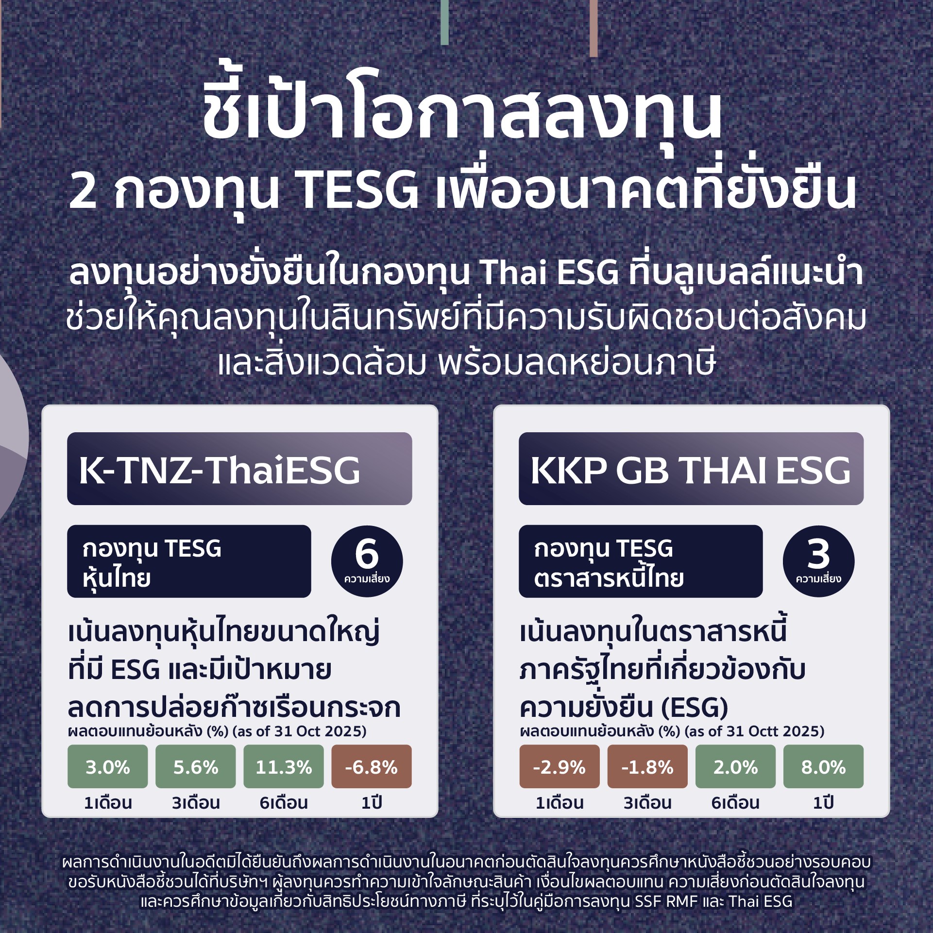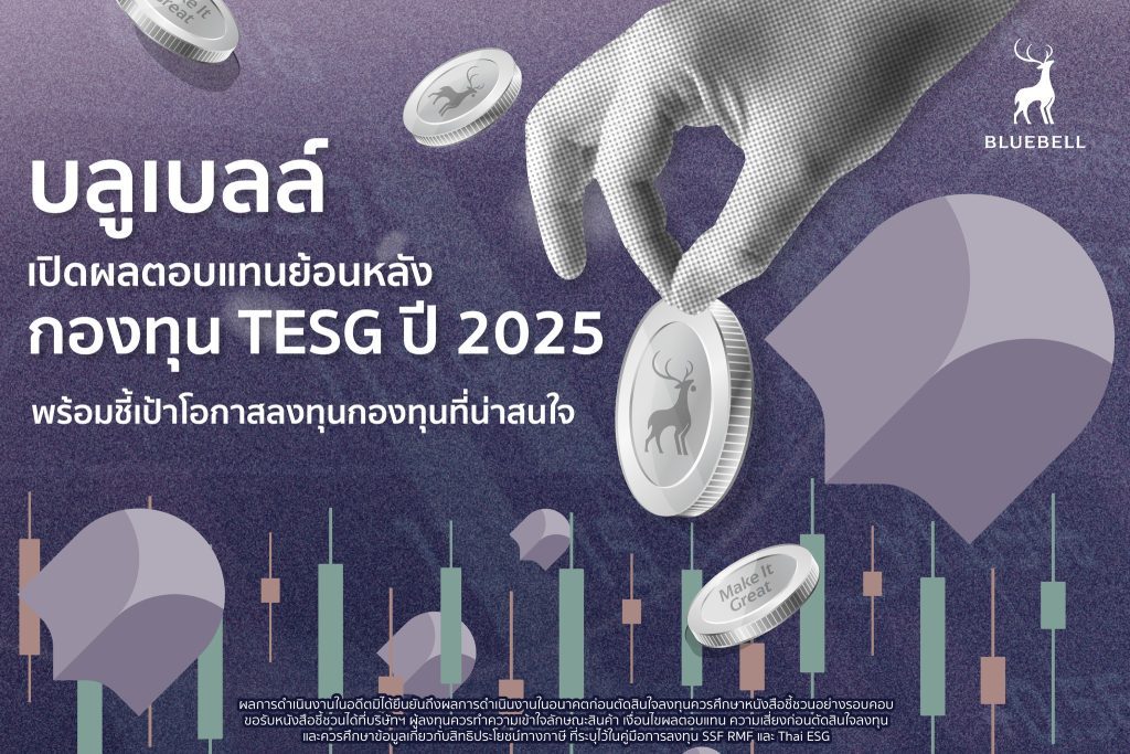 HoonSmart.com>>บล.บลูเบลล์ เปิดผลตอบแทนกองทุน Thai ESG (TESG) สิ้นเดือนต.ค.68 พร้อมชี้เป้าโอกาสลงทุน 2 กองทุน ลงทุนในสินทรัพย์ที่มีความรับผิดชอบต่อสังคมและสิ่งแวดล้อม พร้อมลดหย่อนภาษี ผ่านกองทุน “K-TNZ-ThaiESG” ลงทุนหุ้นไทยขนาดใหญ่มี ESG มีเป้าหมายลดปล่อยก๊าซเรือนกระจก ส่วนกองทุน “KKP GB THAI ESG” ลงทุนตราสารหนี้ภาครัฐไทยที่เกี่ยวข้องกับความยั่งยืน (ESG)
