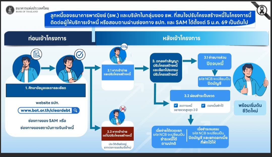 3. การติดต่อกลับและทางเลือกโปรแกรม (ก.พ. 2569 เป็นต้นไป): หลังจากแสดงความประสงค์แล้ว ประมาณช่วงเดือนกุมภาพันธ์ 2569 เจ้าหนี้จะทยอยติดต่อหาลูกหนี้