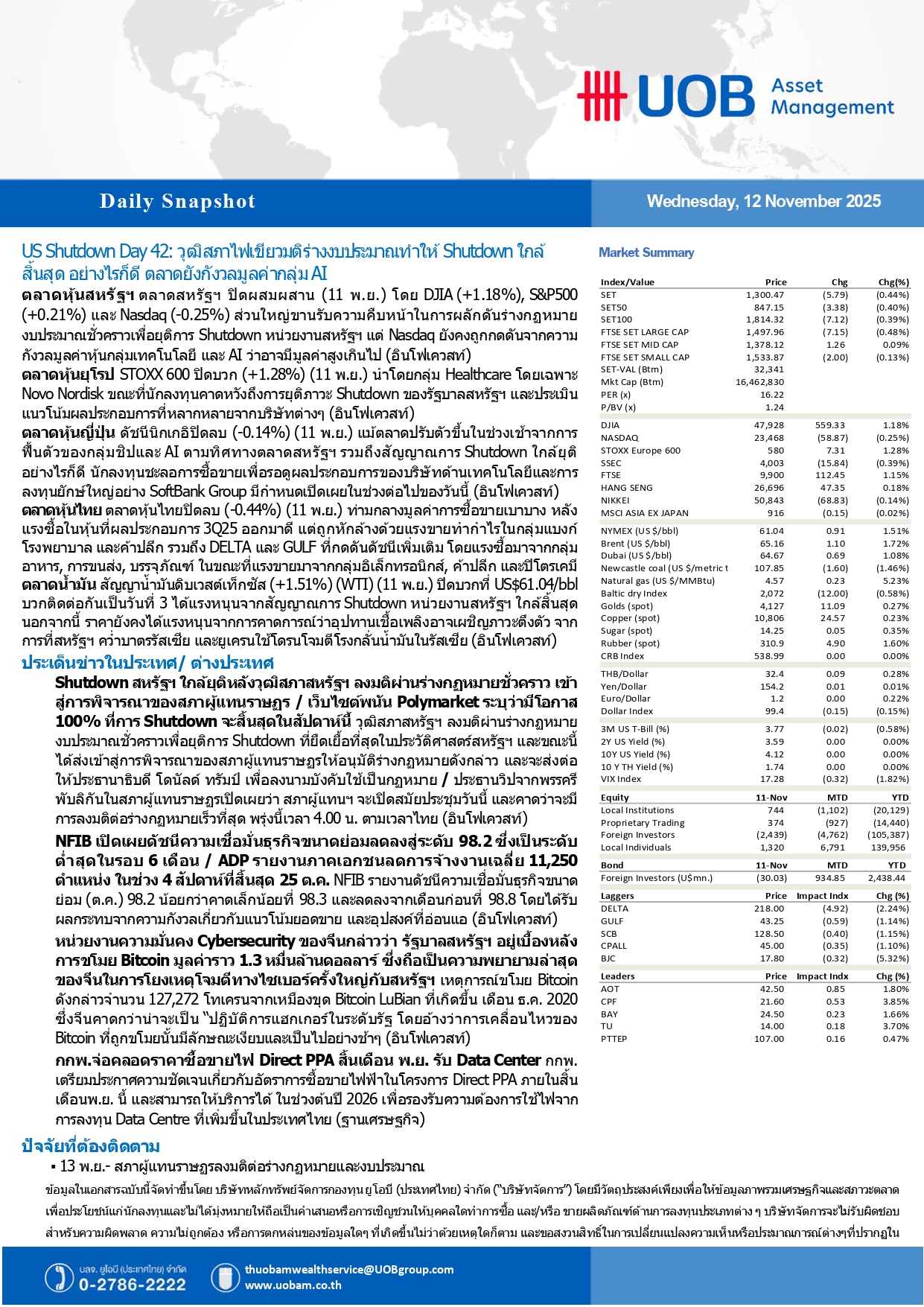 UOBAM : วุฒิสภาไฟเขียวมติร่างงบประมาณหนุน Shutdown ใกล้สิ้นสุด-ตลาดยังกังวลมูลค่ากลุ่ม AI 12/11/2025 09:14009Breaking News, Fund Manager HoonSmart.com>> UOBAM Daily Snapshot : สหรัฐฯชัตดาวน์วันที่ 42 วุฒิสภาไฟเขียวมติร่างงบประมาณ หนุน Shutdown ใกล้สิ้นสุด แต่ตลาดยังกังวลมูลค่ากลุ่ม AI ———————————————————————————————————————————————————– Facebook iconFacebookTwitter iconTwitterLINE iconLine