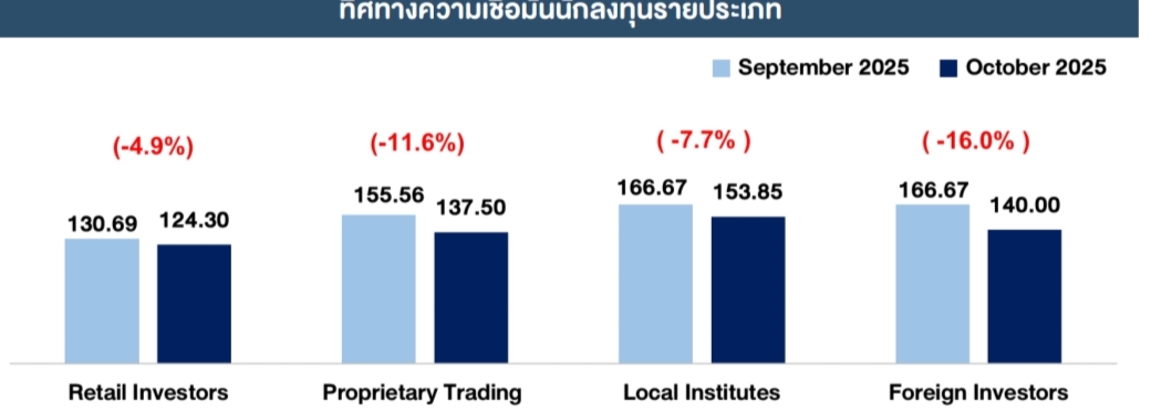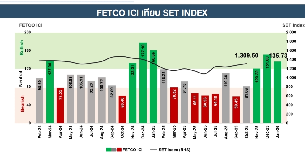 ดร.กอบศักดิ์ ภูตระกูล ประธานกรรมการสภาธุรกิจตลาดทุนไทย (FETCO) เปิดเผยผลสำรวจ ดัชนีความเชื่อมั่นนักลงทุน (FETCO Investor Confidence Index: ICI) เดือนตุลาคม 2568 ซึ่งสำรวจระหว่างวันที่ 20–31 ตุลาคม พบว่า ความเชื่อมั่นนักลงทุนทุกกลุ่ม ทั้งรายย่อย สถาบันทั้งในและต่างประเทศ กลุ่มบัญชีหลักทรัพย์ ในอีก 3 เดือนข้างหน้า (มกราคม 2569) อยู่ในเกณฑ์ “ร้อนแรง” ที่ระดับ 135.73 โดยมีปัจจัยหนุนสำคัญจากมาตรการกระตุ้นเศรษฐกิจของภาครัฐ
