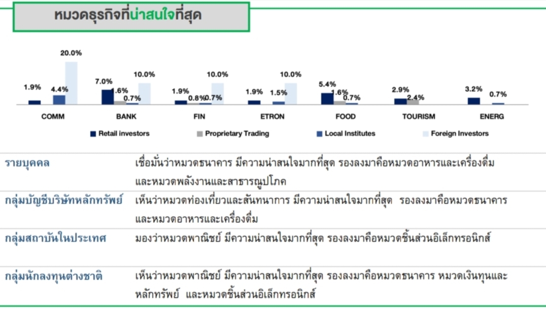 นักลงทุนสนใจลงทุนในหมวดพาณิชย์ (COMM) มากที่สุด รองลงมาคือหมวดธนาคาร (BANK) และหมวดเงินทุนและหลักทรัพย์ (FIN)