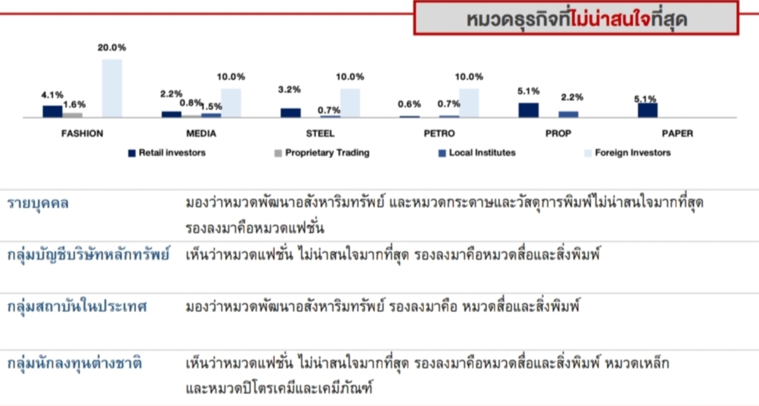 ในขณะที่นักลงทุนเห็นว่าหมวดแฟชั่น (FASHION) ไม่น่าสนใจมากที่สุด รองลงมาคือ หมวดสื่อสิ่งพิมพ์ (MEDIA) และหมวดเหล็ก (STEEL)