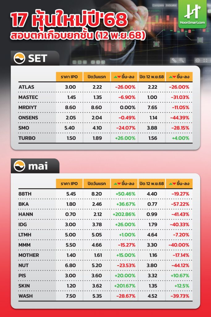 HoonSmart.com>>”หุ้นสมาร์ท”รวบรวมข้อมูลหุ้นเข้าใหม่ในปี 2568 ทั้งหมด 17 บริษัท  ใครถือหุ้นมาจนถึงวันนี้ สอบตกเกือบทั้งหมด เหลือเพียง 3 บริษัทที่สูงกว่าราคาขาย SKIN-PIS-TURBO สภาธุรกิจตลาดทุนไทย ห่วง IPO ต่ำจองบั่นทอนตลาด เตรียมจับเข่าคุย FA และโบรกเกอร์ หารือเรื่องต่ำจอง ปรับแนวทางการตั้งราคาใหม่ พร้อมเสนอให้ดึงดูดบริษัทเทคโนโลยีและธุรกิจแห่งอนาคตเข้ามาจดทะเบียนมากขึ้น
