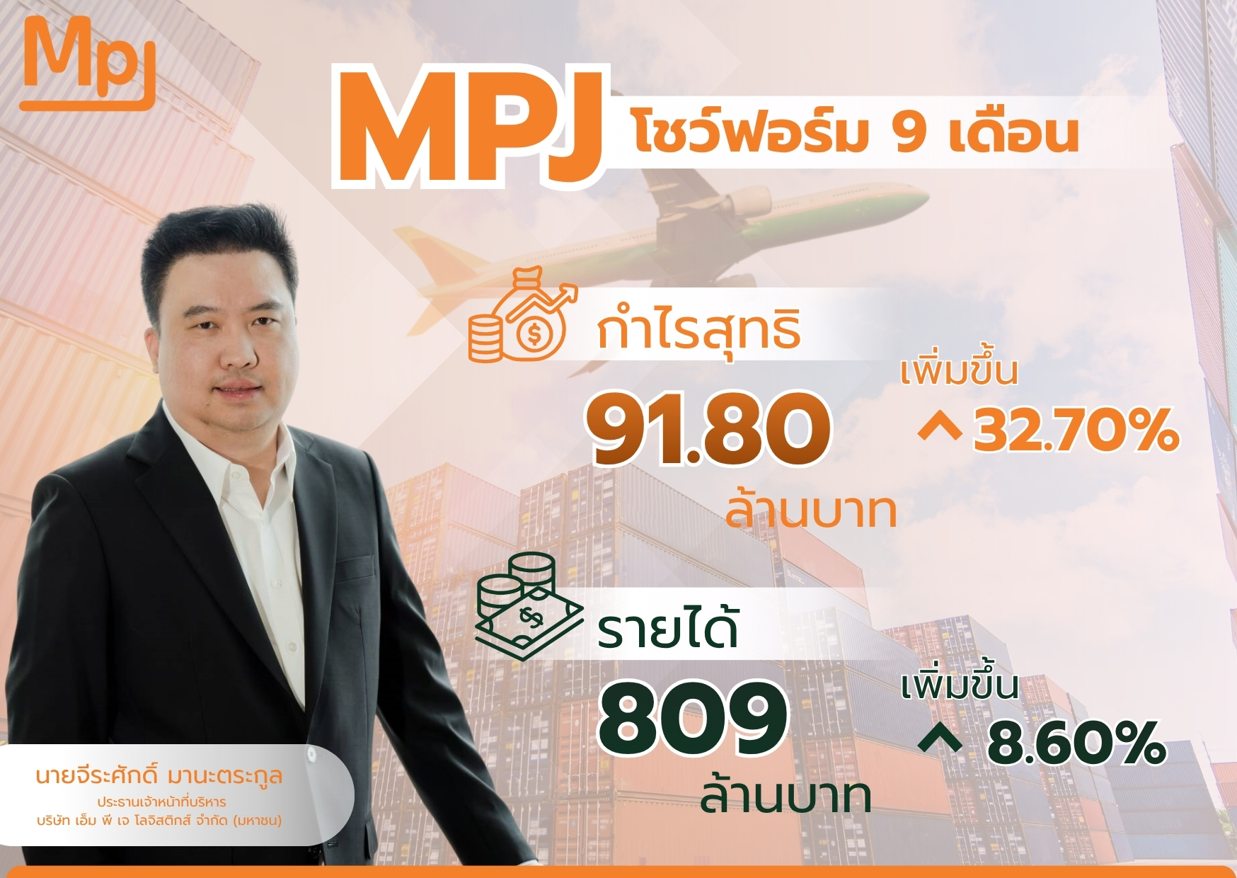 HoonSmart.com>> เอ็ม พี เจ โลจิสติกส์ (MPJ) โชว์ผลการดำเนินงาน 9 เดือนแรกของปี 2568 สะท้อนความแข็งแกร่งของธุรกิจ กวาดกำไรสุทธิ 91.80 ล้านบาท เพิ่มขึ้น 32.70% (YoY) และมีรายได้จากการให้บริการรวม 809 ล้านบาท รับอานิสงส์ 4 กลุ่มธุรกิจเติบโตต่อเนื่อง สวนกระแสเศรษฐกิจโลก-สงครามการค้าที่ผันผวน เดินหน้ารุกต่อยอดการลงทุน เร่งขยายลานตู้คอนเทนเนอร์ พร้อมเล็งเจาะตลาดเอเชียและตะวันออกกลาง ส่งซิกไตรมาส 2/69 จ่อสร้างคลังสินค้าแห่งใหม่ เฟส 2 จ.ระยอง เพื่อรองรับความต้องการของลูกค้าที่เพิ่มขึ้น