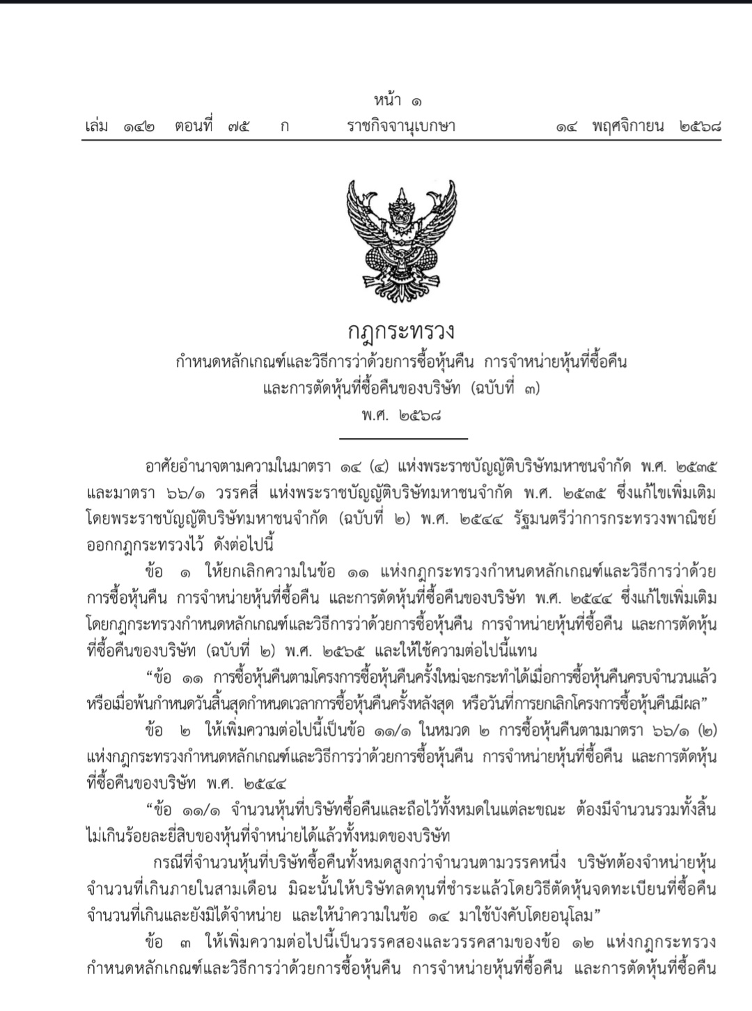 ประกาศราชกิจจานุเบกษา เผยแพร่ กฎกระทรวงกำหนดหลักเกณฑ์และวิธีการว่าด้วยการซื้อหุ้นคืน การจำหน่ายหุ้นที่ซื้อคืน และการตัดหุ้นที่ซื้อคืนของบริษัท (ฉบับที่ ๓) พ.ศ. ๒๕๖๘ เมื่อวันที่ 14 พ.ย. 2568