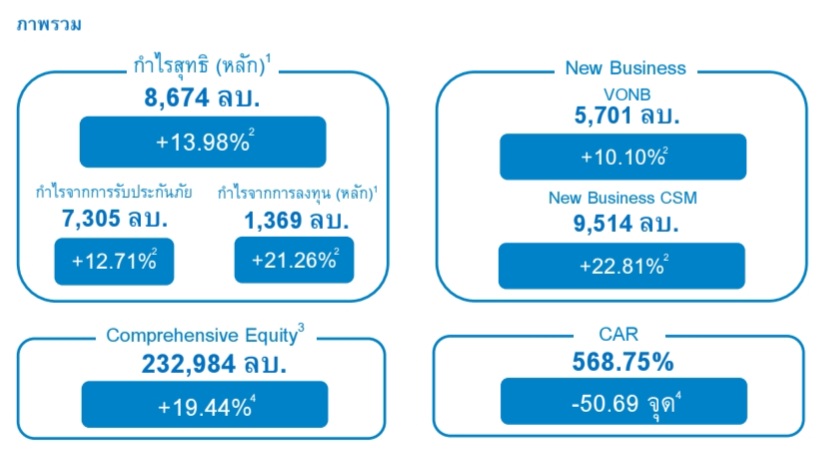 ขณะเดียวกัน กำไรสุทธิในส่วนที่ไม่รวมรายการพิเศษและผลกระทบจากความผันผวนของตลาดช่วง 9 เดือนแรก อยู่ที่ 8,674 ล้านบาท เติบโต 14.0% จากช่วงเดียวกันของปีก่อน โดยบริษัทฯ มีกำไรจากการรับประกันภัยเป็นหลัก อยู่ที่ 7,305 ล้านบาท
