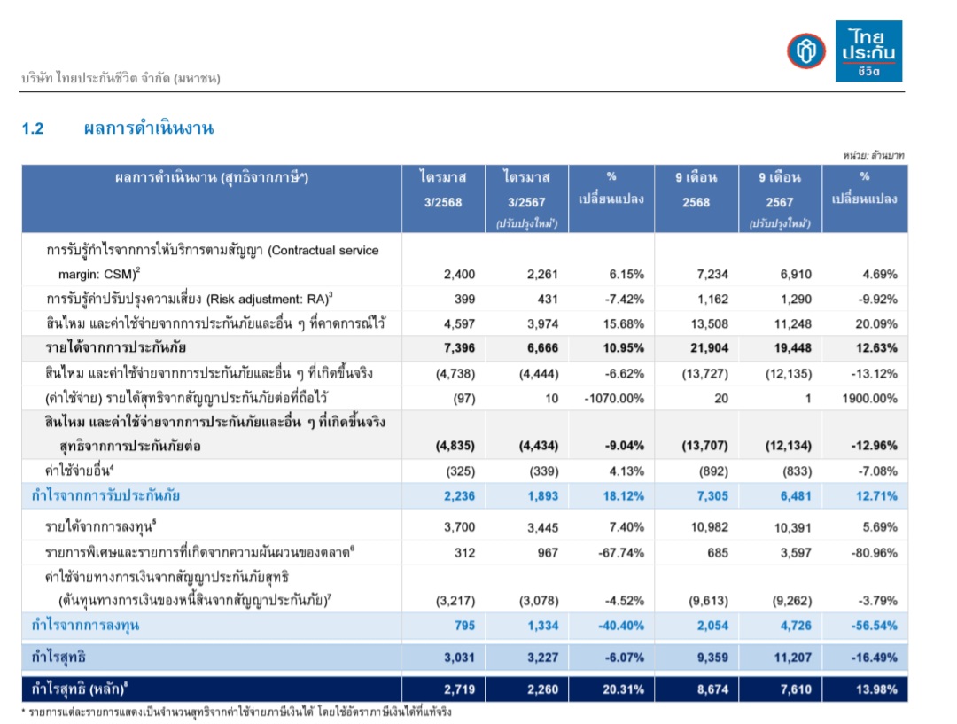 HoonSnart.com>>ไทยประกันชีวิต เปิดผลการดำเนินงาน 9 เดือน ปี 2568 มีมูลค่ากำไรของธุรกิจใหม่ (VONB) อยู่ที่ 5,701 ล้านบาท โต 10.1% กำไรสุทธิ 9,359 ล้านบาท ลดลง 16.49%