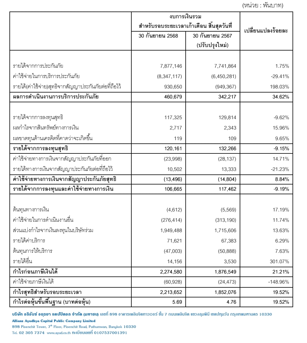 นายโทมัส ชาร์ลส วิลสัน กรรมการผู้อำนวยการและประธานเจ้าหน้าที่บริหาร บริษัท อลิอันซ์ อยุธยา แคปปิตอล (AYUD) เปิดเผยว่า การบริหารจัดการเชิงรุกและการควบคุมต้นทุนมีบทบาทสำคัญในการผลักดันผลประกอบรอบ 9 เดือนสิ้นสุดวันที่ 30 ก.ย. 2568 มีกำไรสุทธิ 2,213.65 ล้านบาท หรือหุ้นละ 5.69 บาท เพิ่มขึ้น 361.57 ล้านบาทจากช่วงเดียวกันปีก่อน คิดเป็นการเติบโต 19.52%