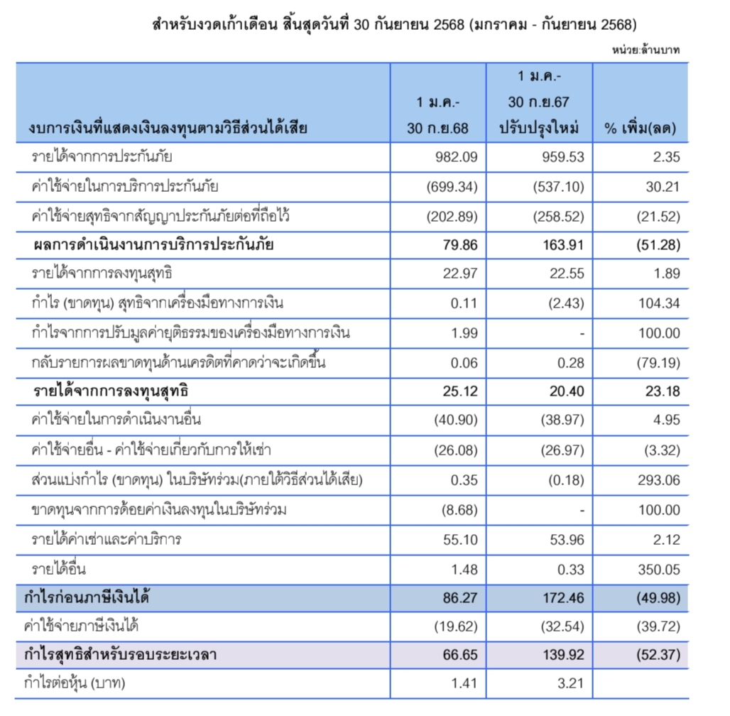 สำหรับผลประกอบการรวม 9 เดือน บริษัทมีกำไรก่อนภาษี 86.27 ล้านบาท ลดลง 49.98% และมีกำไรสุทธิ 66.65 ล้านบาท ลดลง 52.37% คิดเป็นกำไรต่อหุ้น 1.41 บาท ผลการดำเนินงานบริการประกันภัยอยู่ที่ 79.86 ล้านบาท ลดลง 51.28% โดยรายได้จากการประกันภัยรวม 982.09 ล้านบาท เพิ่มขึ้น 2.35% แต่ค่าใช้จ่ายบริการประกันภัยเพิ่มขึ้น 30.21% เป็น 699.34 ล้านบาท ซึ่งรวมผลกระทบจากเหตุการณ์แผ่นดินไหวเมื่อเดือนมีนาคมที่ผ่านมา ขณะที่ค่าใช้จ่ายสุทธิจากสัญญาประกันภัยต่อปรับลดลง 21.52% อยู่ที่ 202.89 ล้านบาท รายได้จากการลงทุนสุทธิอยู่ที่ 25.12 ล้านบาท เพิ่มขึ้น 23.18%