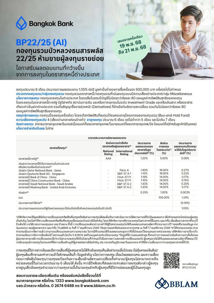 HoonSmart.com>>บลจ.บัวหลวง (BBLAM) เสนอขาย ‘กองทุนรวมบัวหลวงธนสารพลัส 22/25 ห้ามขายผู้ลงทุนรายย่อย’ หรือ BP22/25(AI) เป็นเทอมฟันด์ อายุ 6 เดือน วันที่ 19-21 พ.ย.68 นี้ ลงทุนขั้นต่ำ 500,000 บาท เพิ่มทางเลือกให้ผู้ลงทุนที่มองหาการลงทุนในตราสารหนี้ต่างประเทศ เพื่อโอกาสรับผลตอบแทนที่เหมาะสม