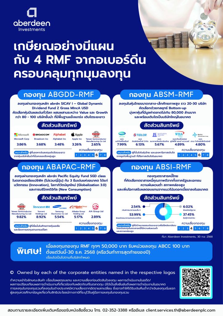 พิเศษ! สำหรับผู้ลงทุนที่ลงทุนในกองทุนประเภท RMF ที่ร่วมรายการกับอเบอร์ดีน ทุกยอดการลงทุน 50,000 บาท ผู้ลงทุนจะได้รับหน่วยลงทุนกองทุนเปิด อเบอร์ดีน แคช ครีเอชั่น (ABCC) มูลค่า 100 บาท ตั้งแต่วันนี้ ถึง 30 ธันวาคม 2568 (หรือวันทำการสุดท้ายของปี) ทั้งนี้ เงื่อนไขเป็นไปตามที่บริษัทกำหนด สอบถามข้อมูลเพิ่มเติมหรือขอรับหนังสือชี้ชวน โทร 02-352-3388 หรือ client.services.th@aberdeenplc.com