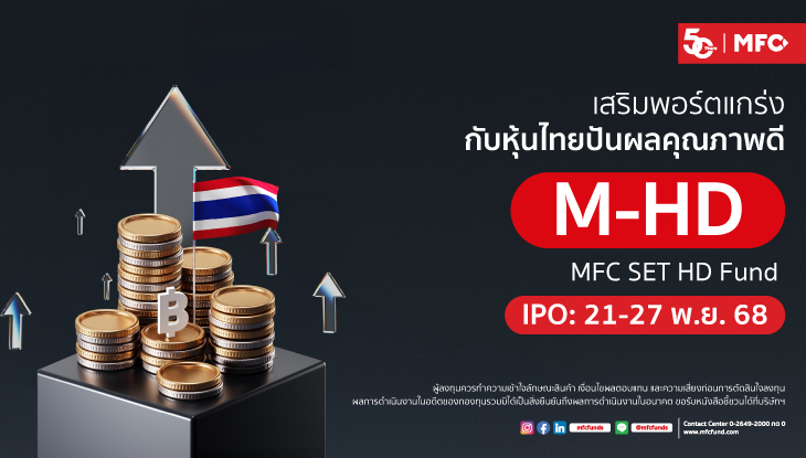 HoonSmart.com>>บลจ.เอ็มเอฟซี เปิดตัว “กองทุนเปิดเอ็มเอฟซี เซ็ท ไฮ ดิวิเดนด์ หุ้นทุน” (M-HD) เพิ่มทางเลือกลงทุน “หุ้นปันผลไทย” ราคายังไม่แพง อัตราผลตอบแทนเงินปันผลสูง โอกาสสร้างผลตอบแทนในระยะยาว พร้อมรับมือความไม่แน่นอนของทิศทางนโยบายเฟด ปัจจัยทางภูมิรัฐศาสตร์ มองแนวโน้มหุ้นไทยปี 69 ฟื้นตัวต่อเนื่อง เปิดขาย IPO 21-27 พ.ย 68