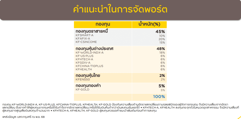 HoonSmart.com>>บลจ.กรุงศรี โชว์ผลงานปี 68 มูลค่า AUM เติบโตแตะ 7.15 แสนล้านบาท เพิ่มขึ้น 10% โตเหนืออุตสาหกรรม เงินไหลเข้าลงทุนสุทธิกว่า 5.7 หมื่นล้านบาท ตั้งเป้าปี 69 AUM โตทะลุ 8 แสนล้านบาท ส่วนมุมมอง “หุ้นไทย” ลุ้นดัชนี 1,420 จุด ชูหุ้นกลุ่มปันผลสูงยังน่าสนใจ ตลาดต่างประเทศ “หุ้นสหรัฐฯ-หุ้นเฮลธ์แคร์-หุ้นเทคจีน” ยังน่าสนใจ พร้อมแนะนำจัดพอร์ตกระจายลงทุนตราสารหนี้ 45% หุ้นต่างประเทศ 48% หุ้นไทย 2% ทองคำ 5%