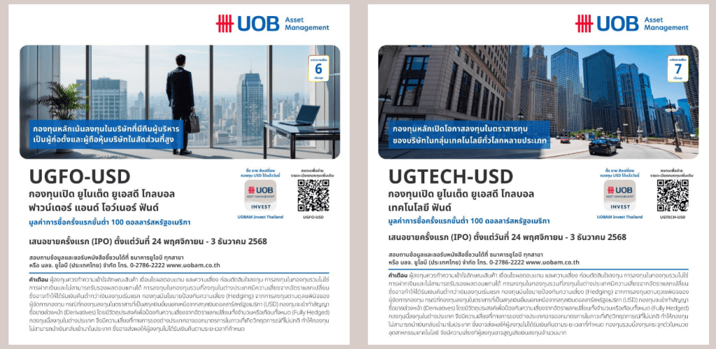 บริษัทหลักทรัพย์จัดการกองทุน (บลจ.) ยูโอบี (ประเทศไทย) จำกัด ตอกย้ำความเป็นผู้นำด้านการลงทุนในกองทุนรวมสกุลเงินดอลลาร์สหรัฐ (USD) ด้วยการขึ้นแท่นเป็นผู้นำอันดับ 1 ในอุตสาหกรรมกองทุนรวมสกุลเงิน USD (ที่มา AIMC : ณ 31 ตุลาคม 2568) นำเสนอ 2 กองทุนรวมตราสารทุนในสกุลเงิน USD เพื่อเติมเต็มพอร์ตการลงทุนและขยายโอกาสการลงทุนนอกเหนือจากการลงทุนในสินทรัพย์ประเภทตราสารหนี้ในสกุลเงิน USD โดยเปิดตัวกองทุนเปิด ยูไนเต็ด ยูเอสดี โกลบอล ฟาวน์เดอร์ แอนด์ โอว์เนอร์ ฟันด์ (UGFO-USD) เปิดโอกาสการลงทุนในกองทุนที่เน้นลงทุนในบริษัทที่มี Founders & Owners ในสัดส่วนที่สูงผ่านกองทุนหลัก และ กองทุนเปิด ยูไนเต็ด ยูเอสดี โกลบอล เทคโนโลยี ฟันด์ (UGTECH-USD) เปิดโอกาสการลงทุนในบริษัทกลุ่มเทคโนโลยีทั่วโลกในหลายประเภท (Multi-thematic Approach) ผ่านกองทุนหลัก เปิดเสนอขายครั้งแรก 24 พ.ย. – 3 ธ.ค.2568