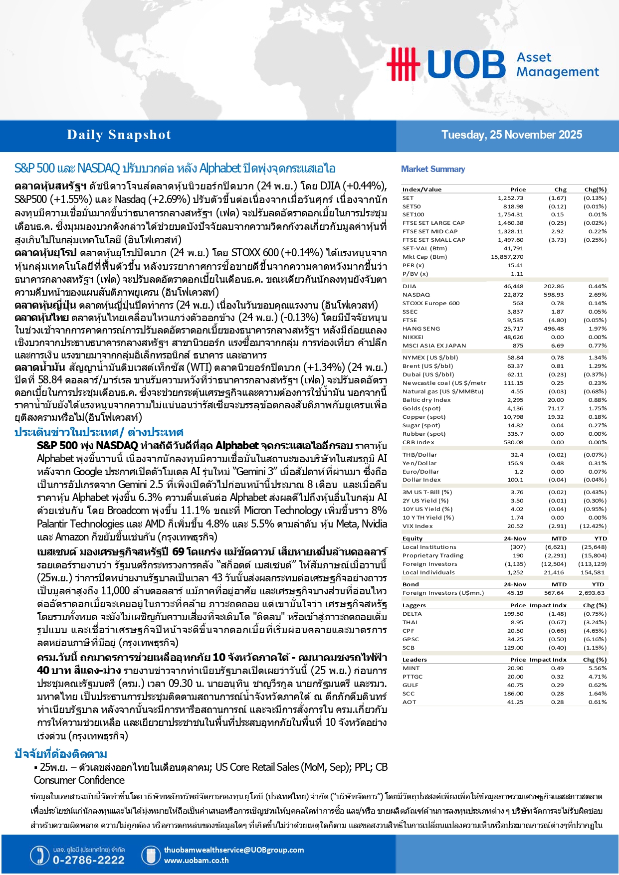UOBAM Daily Snapshot : S&P 500 – NASDAQ ปรับบวกต่อ หลัง Alphabet ปิดพุ่งจุดกระแสเอไอ 25/11/2025 09:4925/11/2025 09:50009Breaking News, Fund ManagerUOBAM ———————————————————————————————————————————————————– Facebook iconFacebookTwitter iconTwitterLINE iconLine