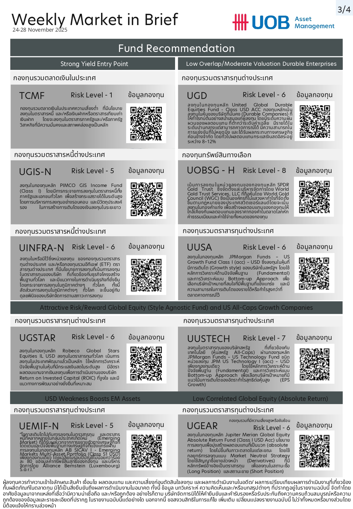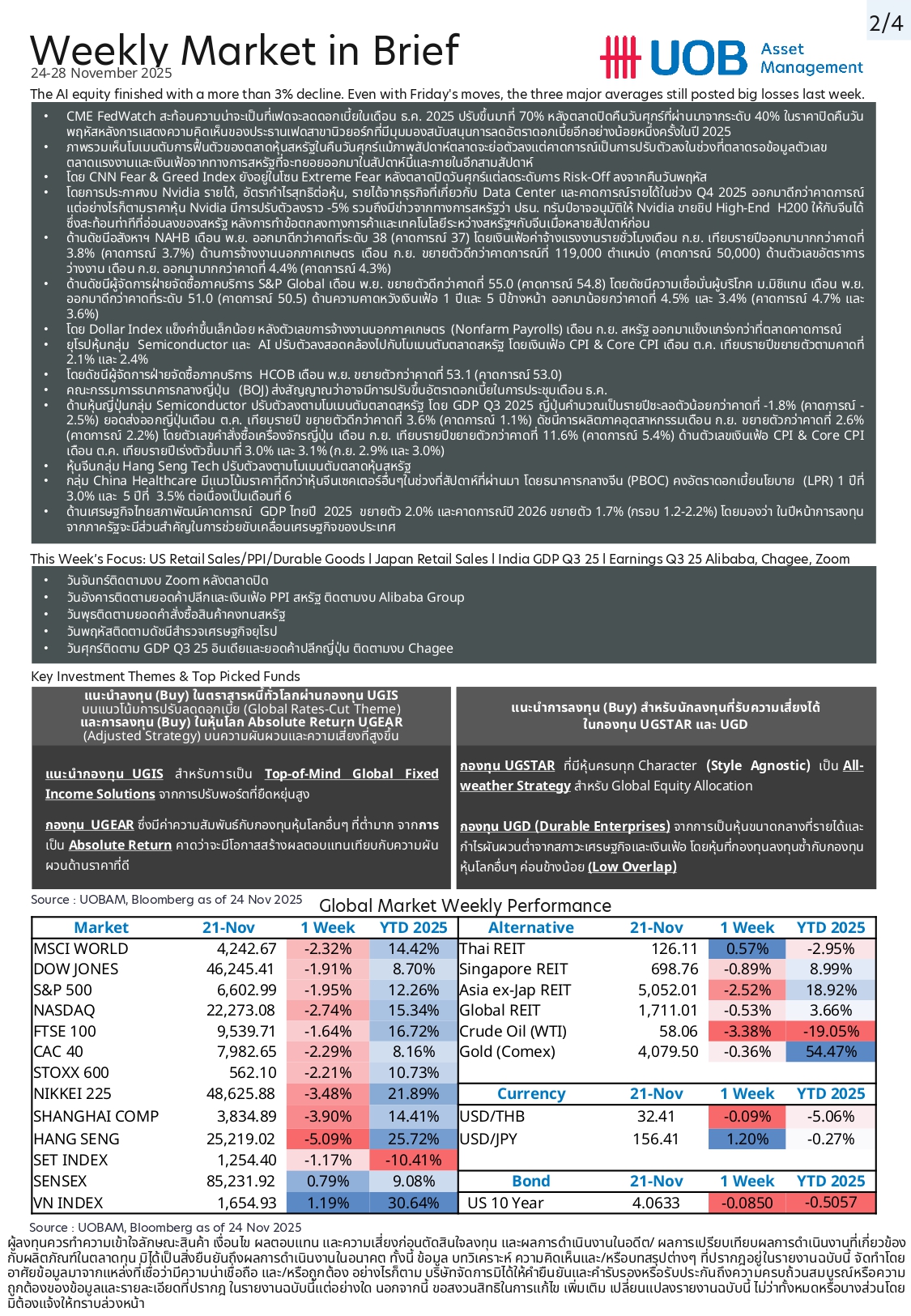 HoonSmart.com>> UOBAM เผยมุมมองการลงทุนสัปดาห์นี้ติดตามยอดค้าปลีก-เงินเฟ้อสหรัฐฯ งบ Alibaba, GDP อินเดียงวดไตรมาส 3/68 และยอดค้าปลีกญี่ปุ่น จากสัปดาห์ก่อนหุ้น AI ปรับตัวลดลงอีก 3% กองทุนแนะนำ UGIS, UGEAR, UGSTAR, UGD