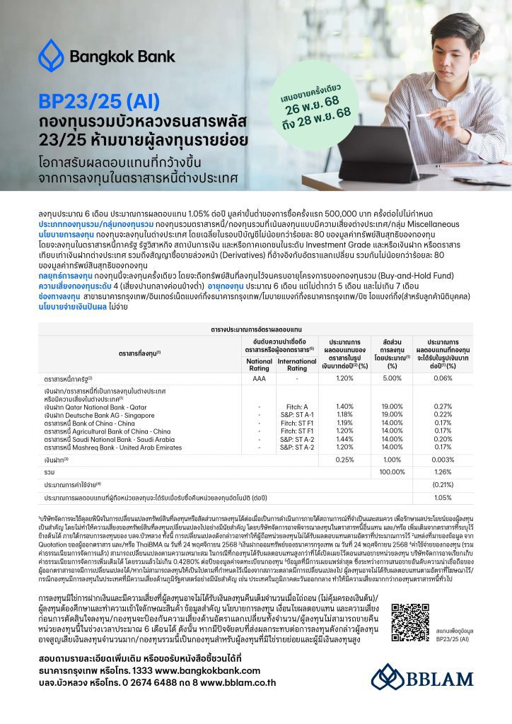 HoonSmart.com>>บลจ.บัวหลวง (BBLAM) เสิร์ฟ ‘กองทุนรวมบัวหลวงธนสารพลัส 23/25 ห้ามขายผู้ลงทุนรายย่อย’ หรือ BP23/25(AI) เทอมฟันด์ อายุ 6 เดือน IPO 26-28 พ.ย.68 นี้ ลงทุนขั้นต่ำ 500,000 บาท ทางเลือกให้ผู้ลงทุนที่มองหาการลงทุนในตราสารหนี้ต่างประเทศเพื่อโอกาสรับผลตอบแทนที่เหมาะสม