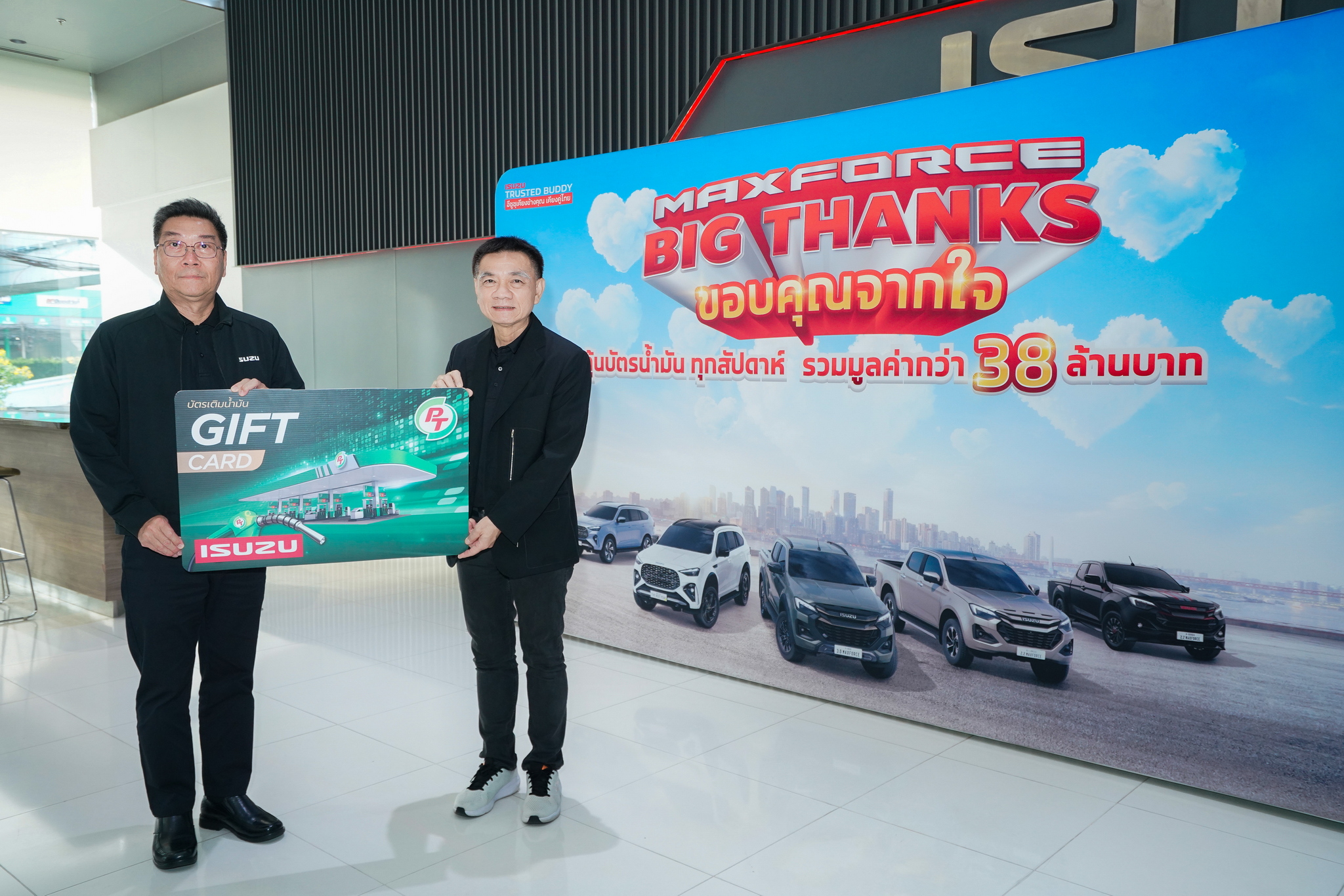 แคมเปญ “MAXFORCE BIG THANKS ขอบคุณจากใจ” สำหรับผู้ที่ซื้อ และรับรถอีซูซุดีแมคซ์ หรือรถยนต์นั่งอเนกประสงค์มิว-เอ็กซ์ ทุกรุ่น จากโชว์รูมอีซูซุทั่วประเทศ ระหว่างวันที่ 25 ตุลาคม – 30 ธันวาคม 2568 จะได้รับสิทธิ์ลุ้นบัตรเติมน้ำมัน PT รวม 1,907 รางวัล มูลค่ารวมกว่า 38,700,900 บาท โดยมีการจับรางวัลทั้งหมด 9 ครั้ง และประกาศผลผ่านทางเฟซบุ๊กเพจ All-New ISUZU D-MAX และ All-New ISUZU MU-X รวมถึงช่องทางผู้จำหน่ายอีซูซุทั่วประเทศ