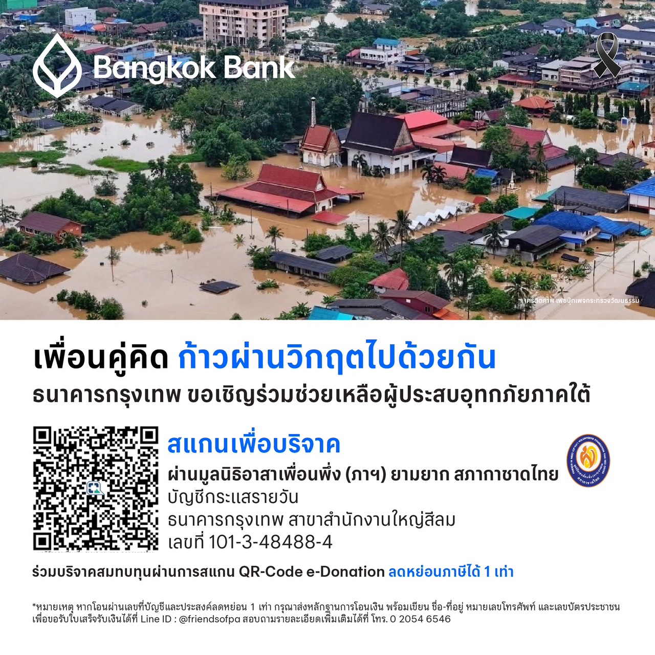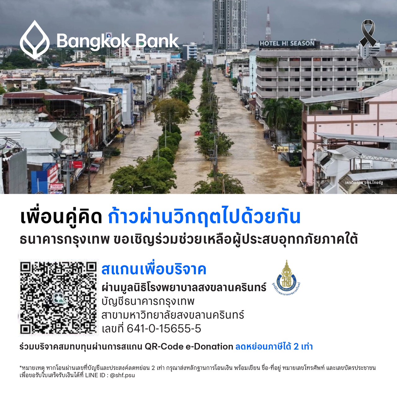 พร้อมกันนี้ ธนาคารขอเชิญร่วมช่วยเหลือผู้ประสบอุทกภัย ผ่านมูลนิธิอาสาเพื่อนพึ่ง (ภาฯ) ยามยาก สภากาชาดไทย กองทุนบูรณะฟื้นฟูอุบัติภัย มูลนิธิชัยพัฒนา และมูลนิธิโรงพยาบาลสงขลานครินทร์ โดยสแกนเพื่อบริจาค หรือ บริจาคผ่านบัญชี