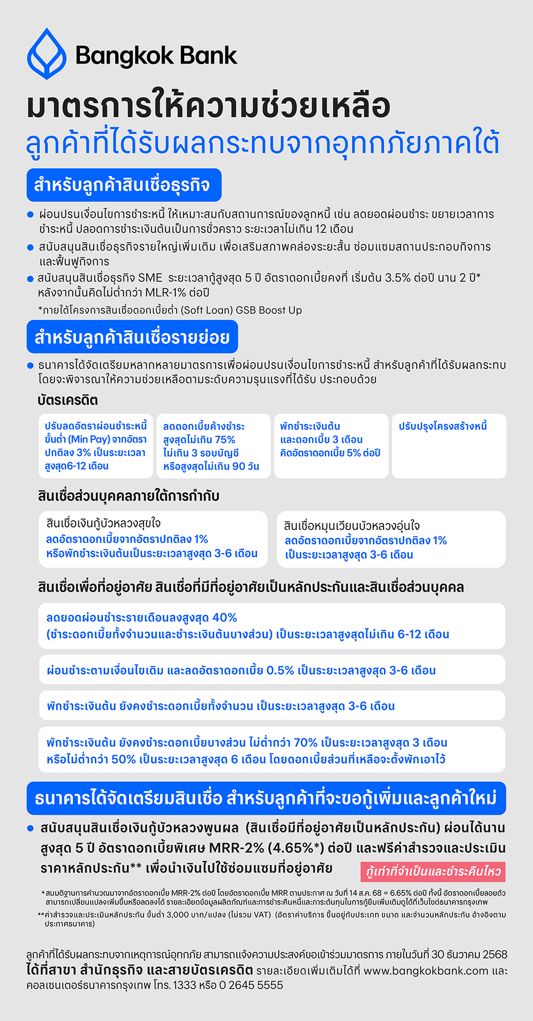ลูกค้าที่ได้รับผลกระทบจากเหตุการณ์อุทกภัย สามารถแจ้งความประสงค์ขอเข้าร่วมมาตรการ ภายในวันที่ 30 ธันวาคม 2568 ได้ที่สาขา สำนักธุรกิจ และสายบัตรเครดิต รายละเอียดเพิ่มเติมได้ที่ www.bangkokbank.com และคอลเซนเตอร์ธนาคารกรุงเทพ โทร.1333 หรือ 0 2645 5555