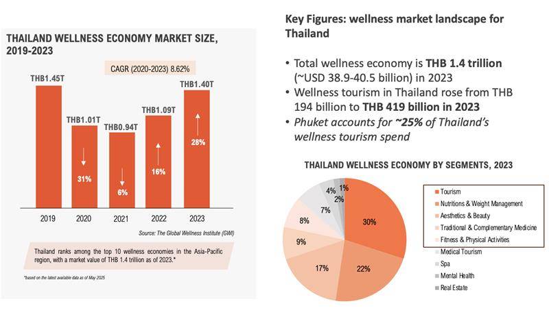 ขณะที่หากโฟกัส ตลาด Wellness Economy ในประเทศไทย มีมูลค่ารวมกันกว่า 1.4 ล้านล้านบาท และมีแนวโน้มขยายตัวในระดับสูงอย่างต่อเนื่อง (ช่วงปี 2563-2566 มีอัตราการเติบโตเฉลี่ยต่อปี (CAGR) ราว 8.62%) โดยมีการคาดการณ์ว่าตลาดนี้จะเติบโตเฉลี่ย 7-10% ต่อปี ได้รับแรงหนุนจากกระแสความใส่ใจในสุขภาพที่เพิ่มขึ้นหลังวิกฤตโควิด-19 และการท่องเที่ยวเชิงสุขภาพ (Wellness Tourism) ที่ประเทศไทยติดอันดับต้น ๆ ของโลกในการเติบโตของตลาดนี้ มีการประมาณการว่าปี 2568 ธุรกิจที่เกี่ยวข้องกับการท่องเที่ยวเชิงสุขภาพสร้างรายได้รวม 6.7 แสนล้านบาท