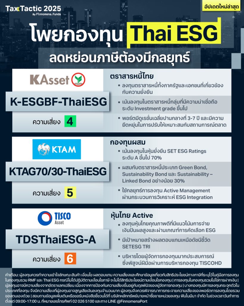 ส่วนกองทุน Thai ESG แนะนำ 3 กองทุน ได้แก่ ตราสารหนี้ไทย: K-ESGBF-THAIESG, กองทุนผสม: KTAG70/30-THAIESG และหุ้นไทย Active: TDSTHAIESG-A