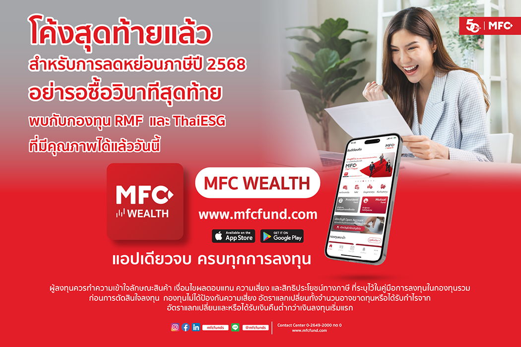 ทั้งนี้ ผู้ที่สนใจสอบถามข้อมูลได้ที่ บลจ. เอ็มเอฟซี โทร. 0-2649-2000 ติดต่อฝ่ายวางแผนการลงทุน กด 2 ข้อมูลเพิ่มเติมได้ที่ www.mfcfund.com